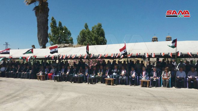 El acto se efectuó con motivo del cuadragésimo sexto aniversario de la izada de la bandera árabe siria en el cielo de la ciudad de Quneitra tras su liberación del ocupante israelí en 1974.