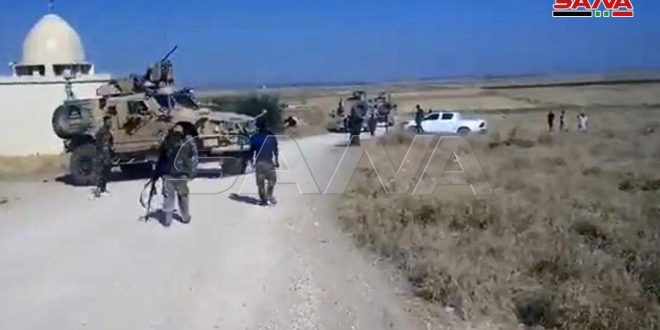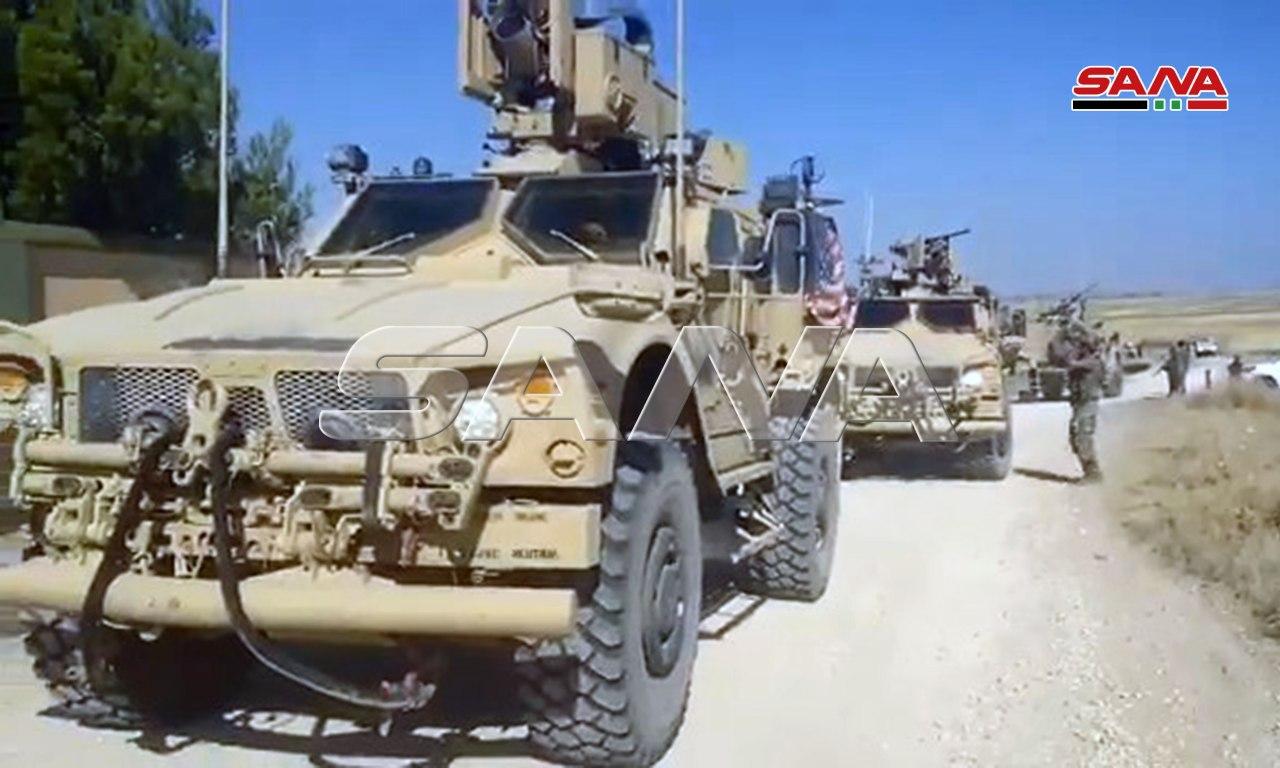 Soldados del Ejército Árabe Sirio bloquearon hoy el camino ante un convoy de vehículos blindados del ocupante estadounidense en la provincia de Hasakeh, 866 kilómetros al nordeste de la capital Damasco.
