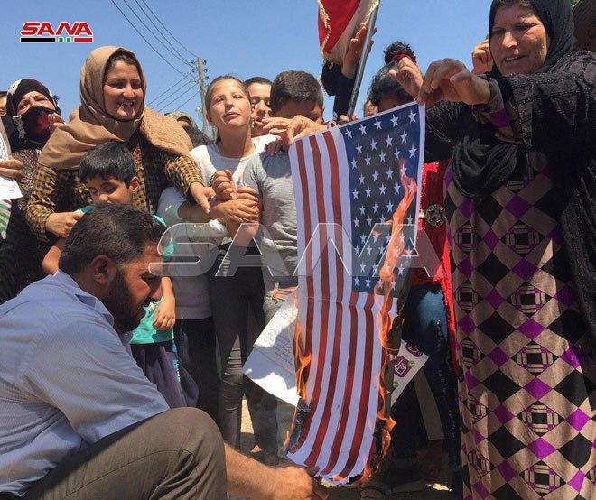 Asimismo, quemaron banderas de EE.UU y levantaron banderas nacionales y pancartas que exigen la salida de la tropas ocupantes y denuncian su saqueo a las riquezas naturales de Siria.