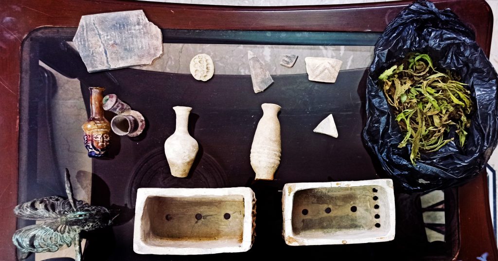 La policía confiscó siete piezas (jarras, recipientes y estatuas de piedra) que fueron devueltas a la Dirección de Arqueología de Hama.