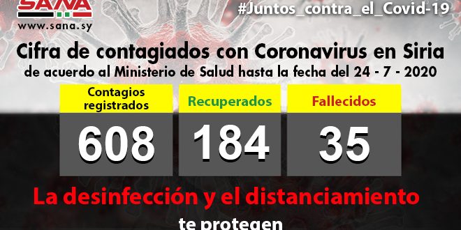 El Ministerio sirio de Salud reportó hoy 24 nuevos casos de Covid-19 y el total asciende a 608.