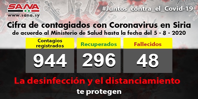 El Ministerio de Salud de Siria anunció este miércoles, 52 nuevos casos de contagio con la Covid-19, lo que eleva la cifra total en Siria a 944.