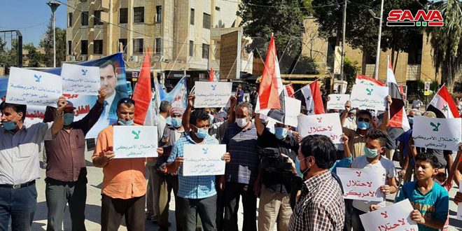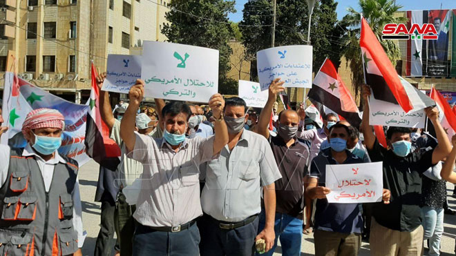 Los manifestantes exigieron la salida de los ocupantes turco y estadounidense, y llamaron a la resistencia, al apego al Ejército Árabe Sirio y reactivar el rol de la resistencia popular para expulsar al ocupante que viola la soberanía de Siria y sus riquezas.