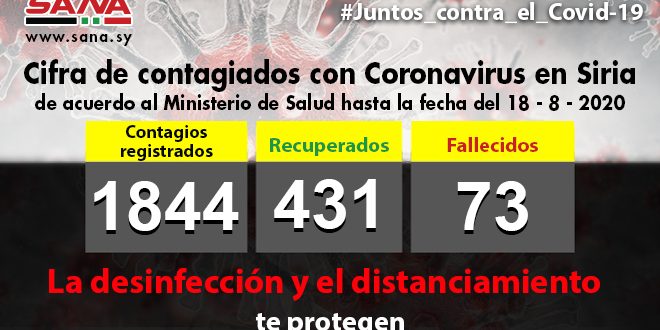 El Ministerio de Salud de Siria anunció 80 nuevos casos con Covid-19 para un total de mil 1844.