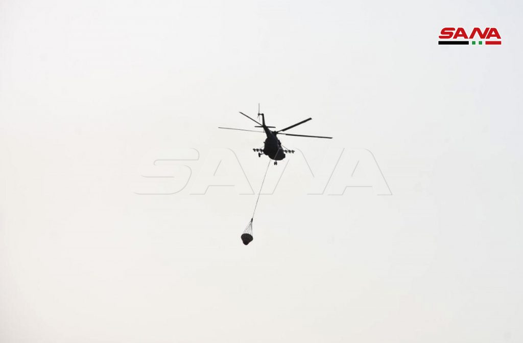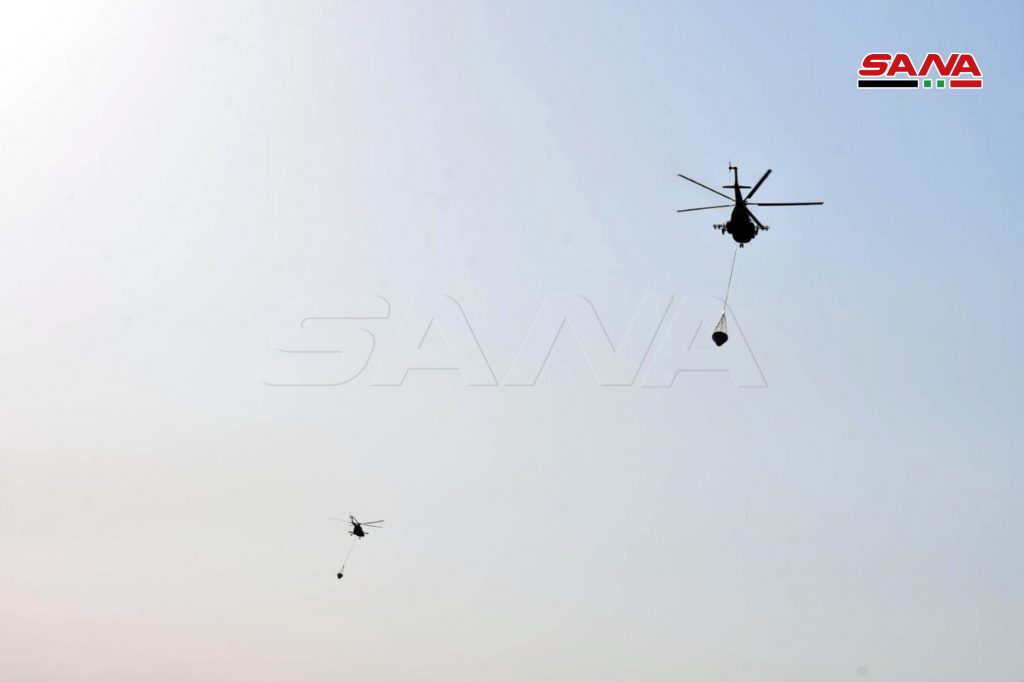 Helicópteros del Ejército Árabe Sirio participan en la operación de extinción de los incendios que asolan los bosques de la localidad de al-Hailuna en el oeste de la provincia de Hama.