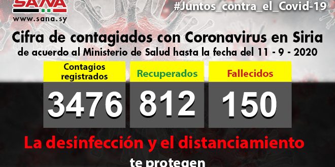 El Ministerio de Salud de Siria reportó 60 nuevos casos por contagio de la Covid-19 y la cifra total llegó a tres mil 476, con la mayoría de los casos detectados en Alepo (30) y en Damasco (21).