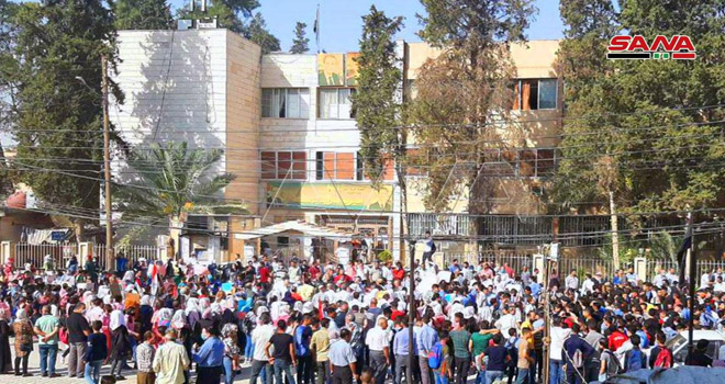 Según reportes del corresponsal de SANA, la concentración tuvo lugar frente al Departamento de Educación Provincial donde los educadores y los estudiantes protestaron contra las prácticas de FDS que se apoderó de las escuelas y privó a miles de estudiantes de su derecho a la educación.