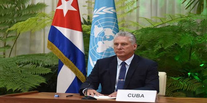 En un discurso por videoconferencia ante el 75º período de sesiones de la Asamblea General de las Naciones Unidas, el mandatario cubano dijo que la solución en Siria debe avanzar sin ninguna injerencia externa y con el pleno respeto a la unidad e integridad del territorio de Siria.