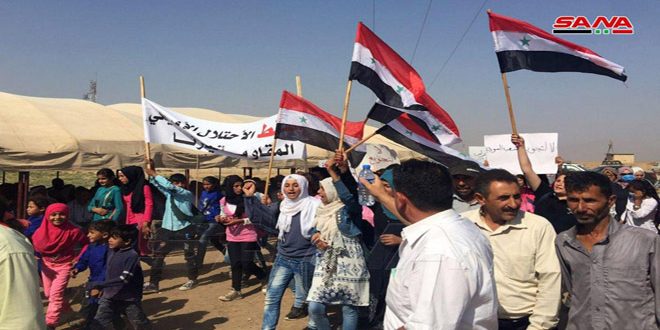 Los lugareños del pueblo de Tal Sateh en el municipio de Qamishli organizaron una marcha popular para exigir la expulsión de las fuerzas de ocupación estadounidenses y turcas de las tierras sirias y, también condenar las medidas económicas coercitivas unilaterales impuestas al pueblo sirio.