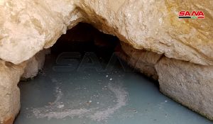 Esta agua fluye entre las rocas de una cueva de 400 metros de profundidad dentro de la montaña Al-Mintar y llega al oasis de palmeras y olivos, que era un lugar de descanso para las caravanas entre Iraq y Siria.