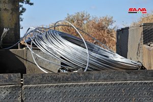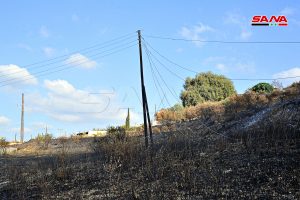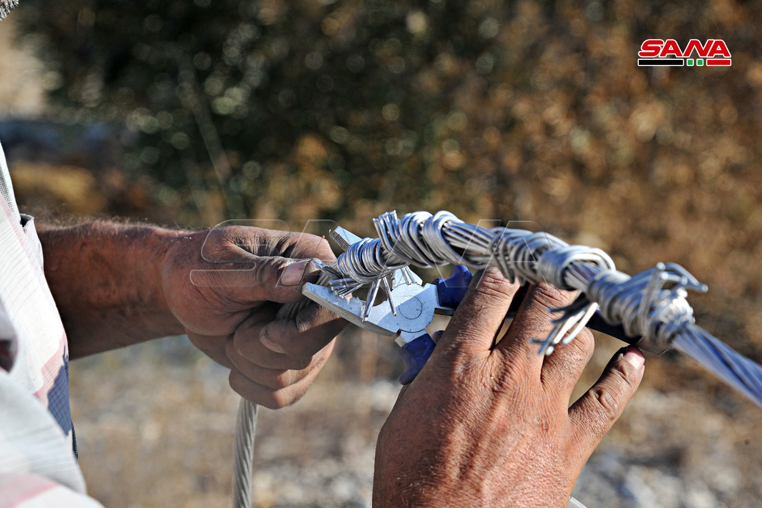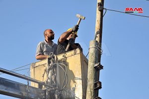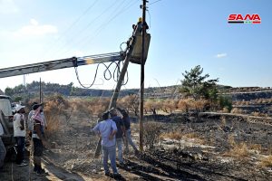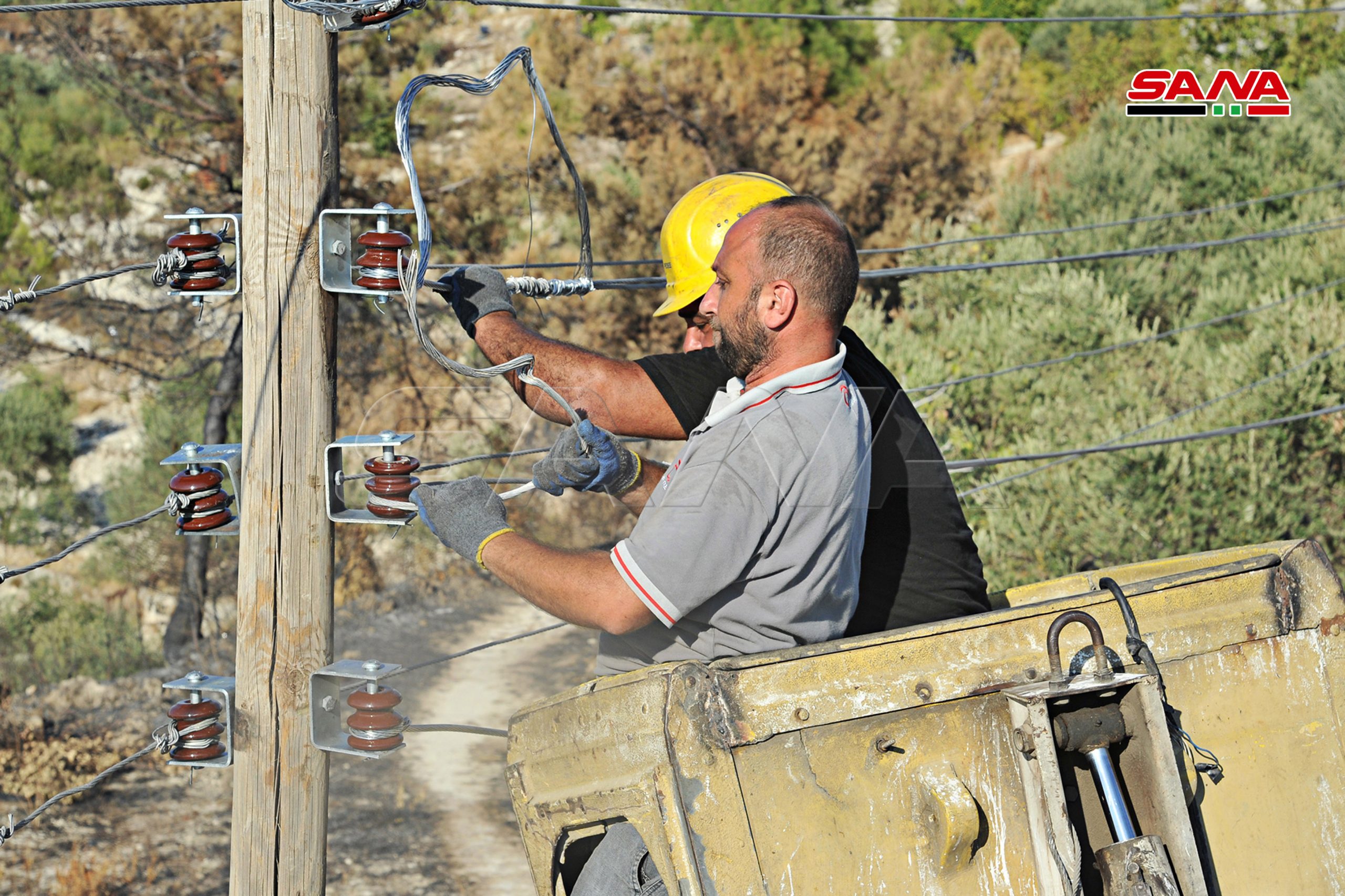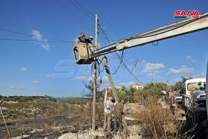 Esfuerzos continuos por el personal de la Compañía de Electricidad de la provincia costera de Latakia para reparar los daños causados por los recientes incendios