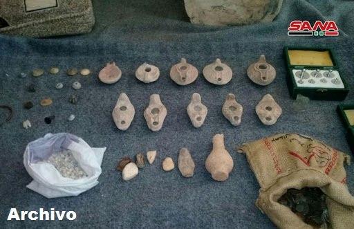 El Departamento de Seguridad Penal de la provincia central de Homs, a unos 160 kilómetros al norte de la capital Damasco, incautó piezas arqueológicas que estaban enterradas por los grupos terroristas en una tierra agrícola en el pueblo de Ghantou.