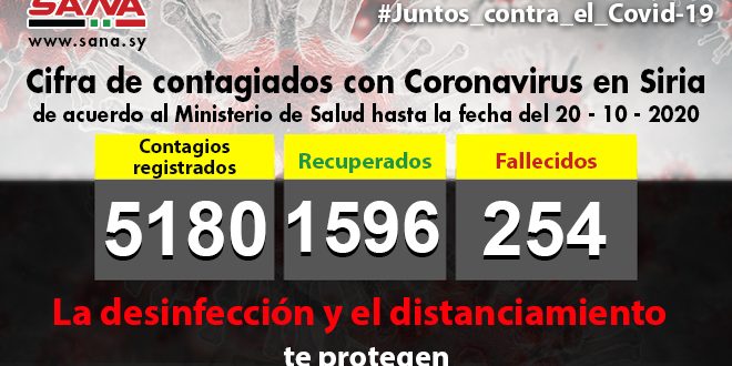 El Ministerio sirio de Salud reportó este martes, 46 nuevos casos de Covid-19 y la suma total asciende a cinco mil 180 desde que se confirmó el primer caso de este virus en este país el pasado día 22 de marzo.