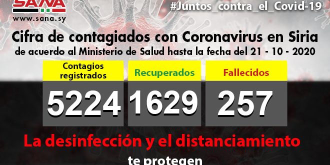 El Ministerio sirio de Salud reportó este miércoles, 44 nuevos casos de Covid-19 y la suma total asciende a cinco mil 224 desde que se confirmó el primer caso de este virus en este país el pasado día 22 de marzo.