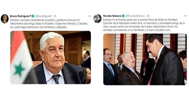 “Expreso mi profundo pesar por la partida física de Walid al-Moallem, Canciller de la República Árabe Siria. Un hermano y entrañable amigo de la vida, a quien conocí en el transitar de la labor diplomática. Envío mis sentidas condolencias a sus familiares y a todo el pueblo sirio”, escribió el mandatario venezolano en su cuenta de Twitter.