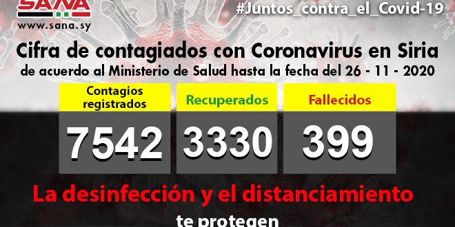 Se confirmaron en las últimas 24 horas, 83 nuevas infecciones por Covid-19 lo cual eleva la cifra nacional a 7542, anunció hoy el Ministerio de Salud de Siria.
