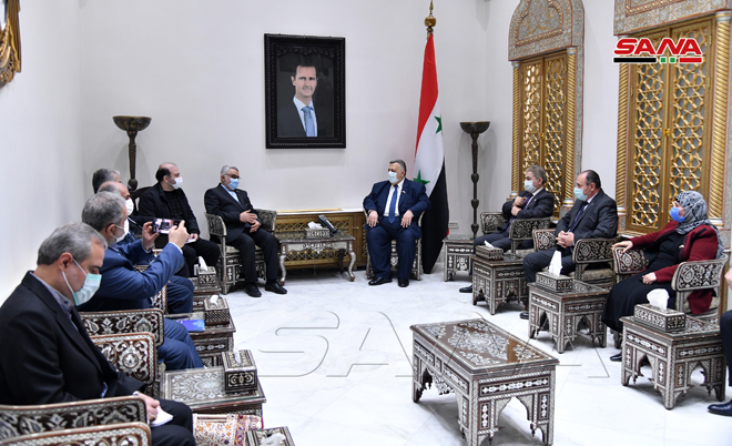El presidente del Parlamento sirio, Hammoudah Sabbag, recibió a Alaeddin Boruyerdi, asesor de asuntos internacionales de la Universidad Islámica iraní de Azad y la delegación acompañante.
