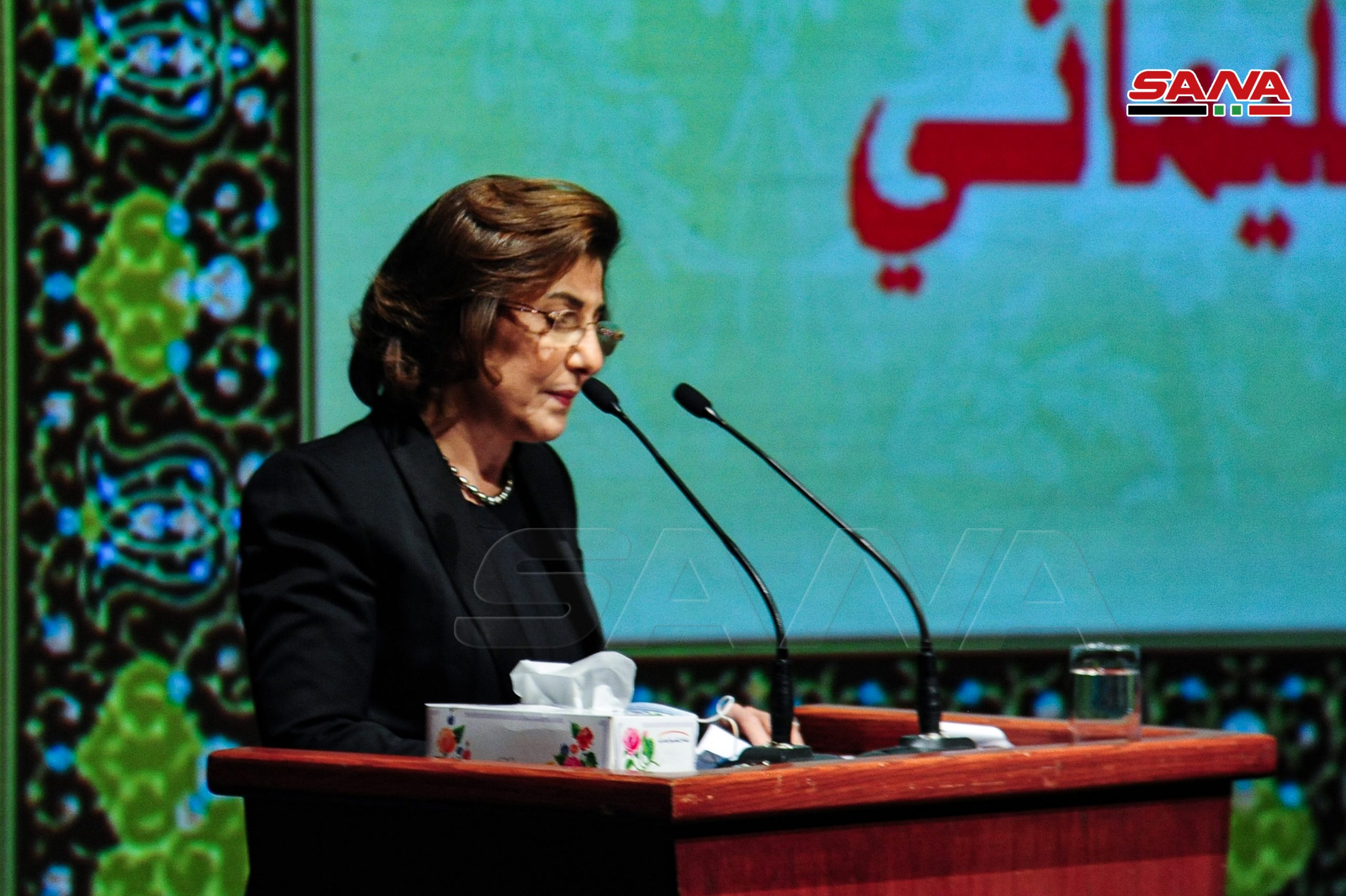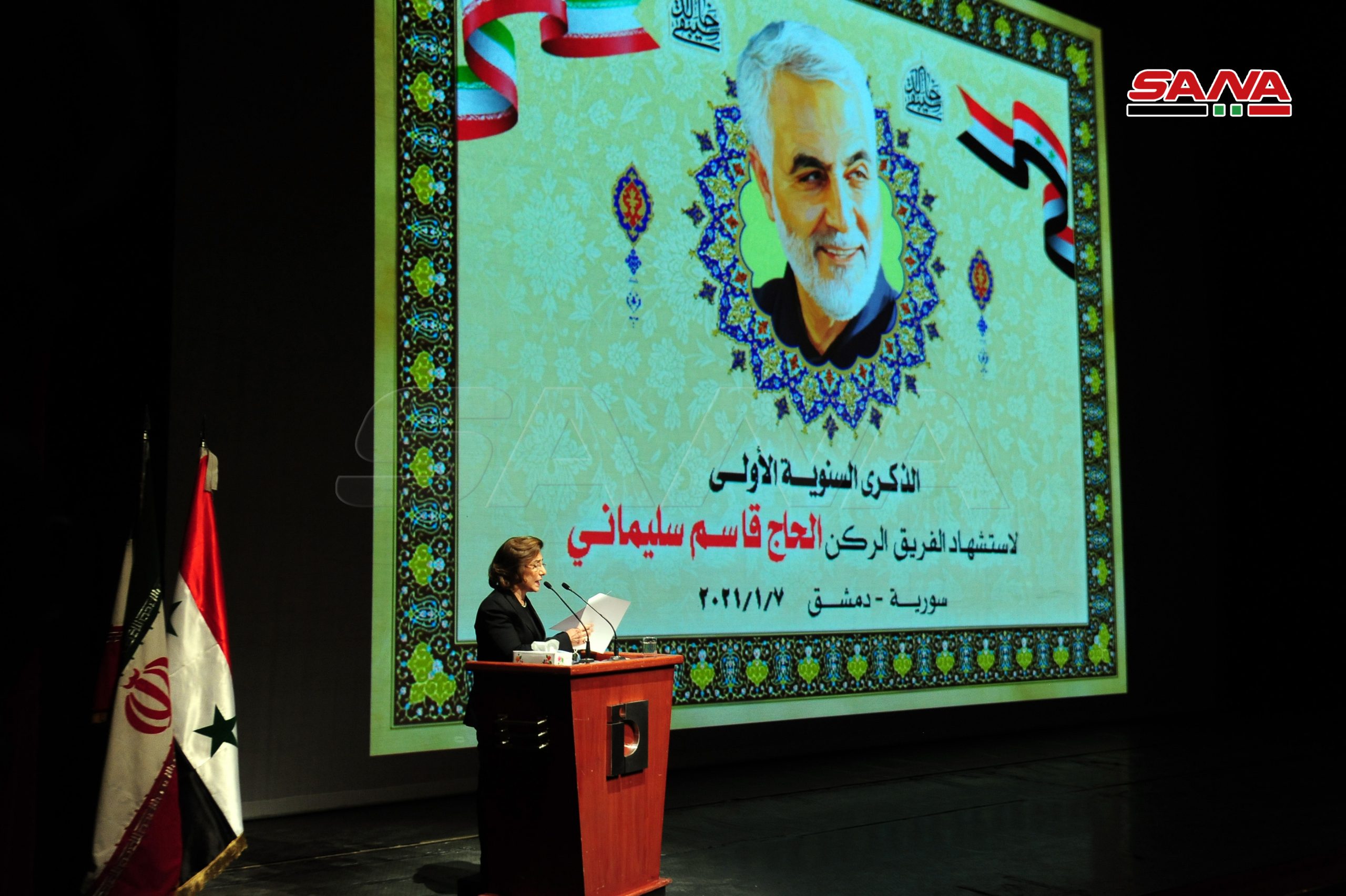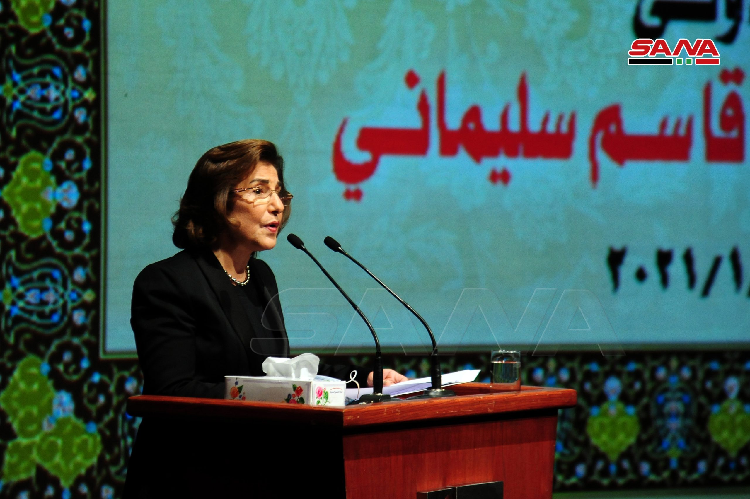 El representante del Presidente Bashar al-Assad, la Dra. Buthaina Shaaban, asesora especial de la Presidencia de la República, subrayó en un discurso durante la ceremonia que el verdadero motivo del asesinato del general Qassem Soleimani es liquidar la referencia política, militar y moral contra la tiranía y la ocupación.
