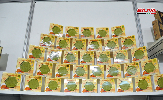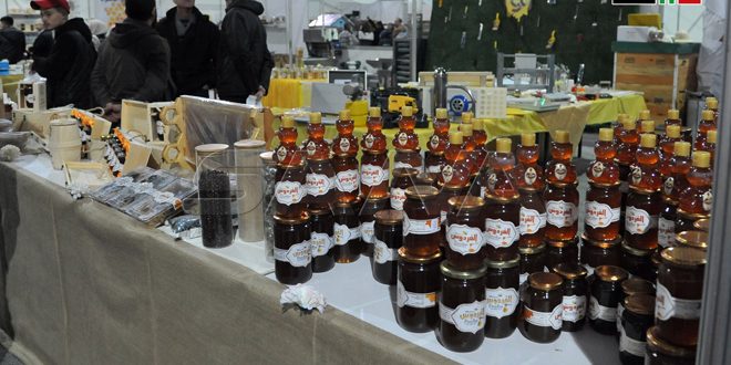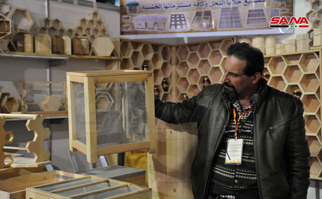 Se exhiben en la feria que se celebra bajo el lema: “Miel.. alimento, medicina y curación”, productos de los apicultores sirios, requisitos de producción y colmenas de madera.