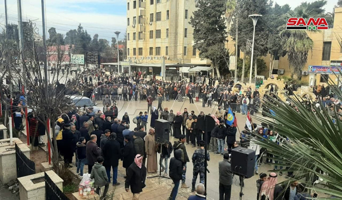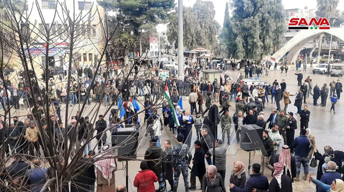 Los manifestantes levantaron pancartas con frases que denuncian las violaciones del ejército de ocupación turco y sus mercenarios, y de la milicia FDS que implementa agendas de su amo estadounidense para que continúe el caos que favorece el robo y saqueo de las riquezas del pueblo sirio.