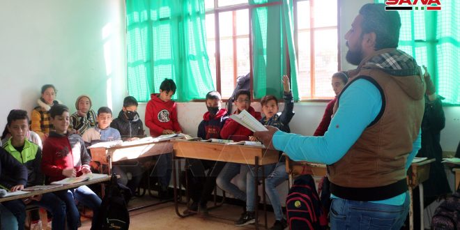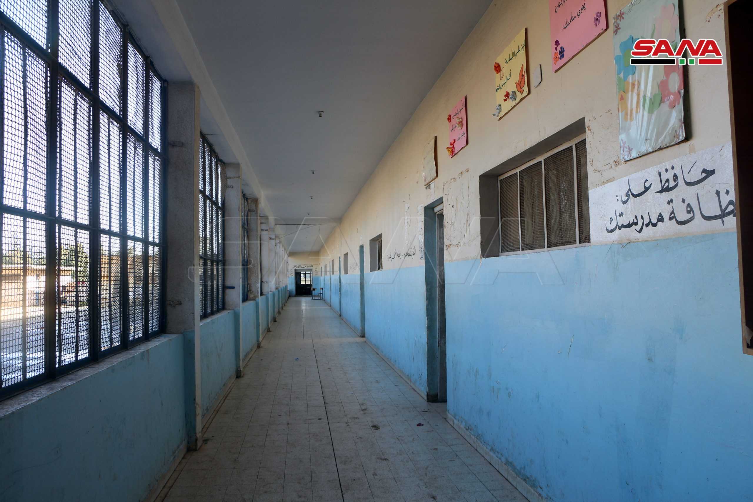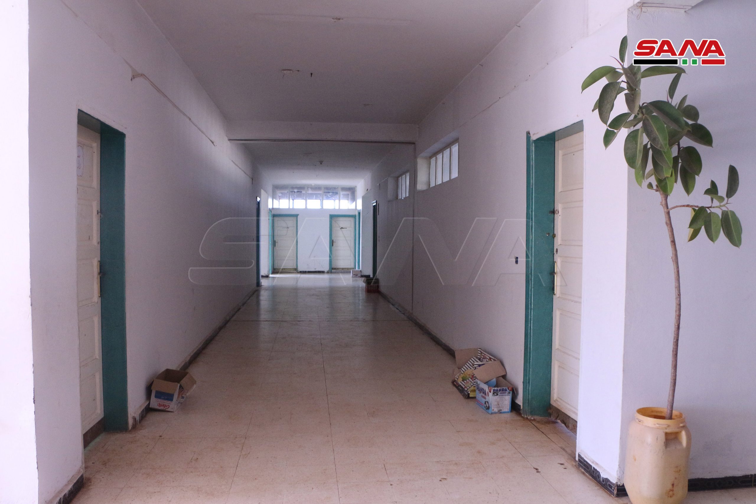 Voluntarios y actores locales en la ciudad de Sanamein en la provincia sureña de Deraa completaron la rehabilitación de una escuela que fue convertida anteriormente en centro de residencia temporal para desplazados a causa del terrorismo.
