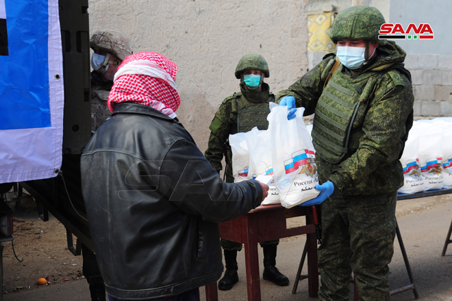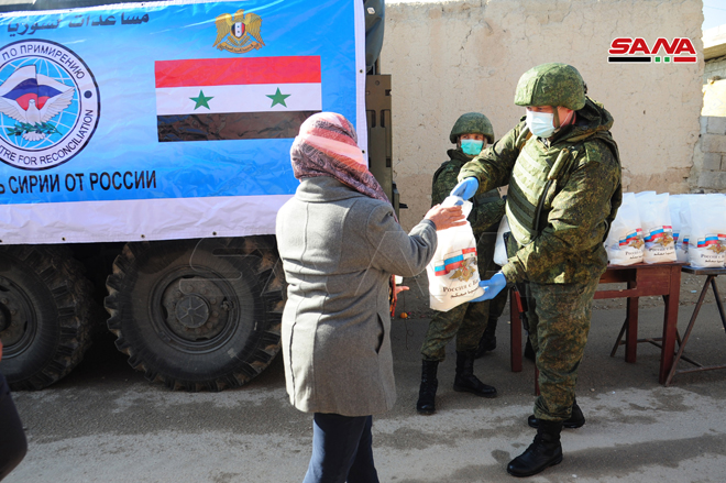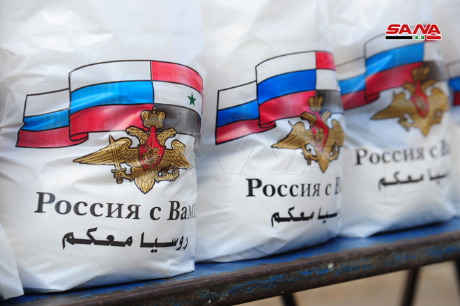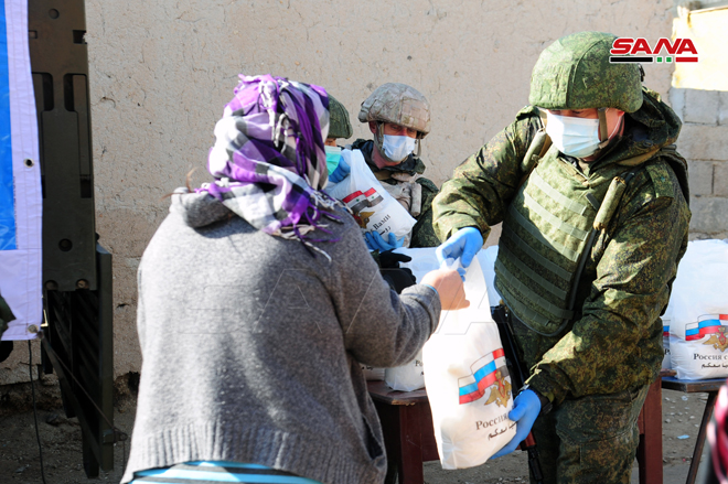 En el marco de la amistad y cooperación entre Siria y Rusia, el Centro de Coordinación Ruso distribuyó canastas de alimentos en la localidad de Al- Bitariya al sur de la capital Damasco.
