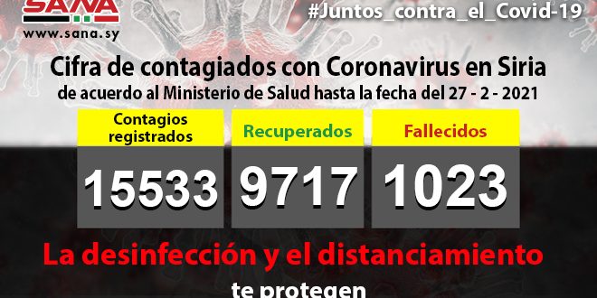 El Ministerio de Salud de Siria anunció 66 nuevos casos con Covid-19 para un total de 15 mil 533.