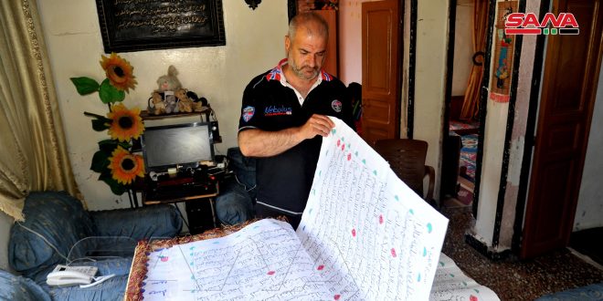 En su casa rural modesta en el poblado de al-Dalia (campo de Latakia) los esfuerzos del hombre cuarentón Akzam Salame se coronaron con éxito después de tres año y medio de trabajo arduo y voluntad férrea para lograr la mayora copia del Corán escrita a mano, pues Salame es un aficionado a la caligrafía árabe y un ducho en la materia.