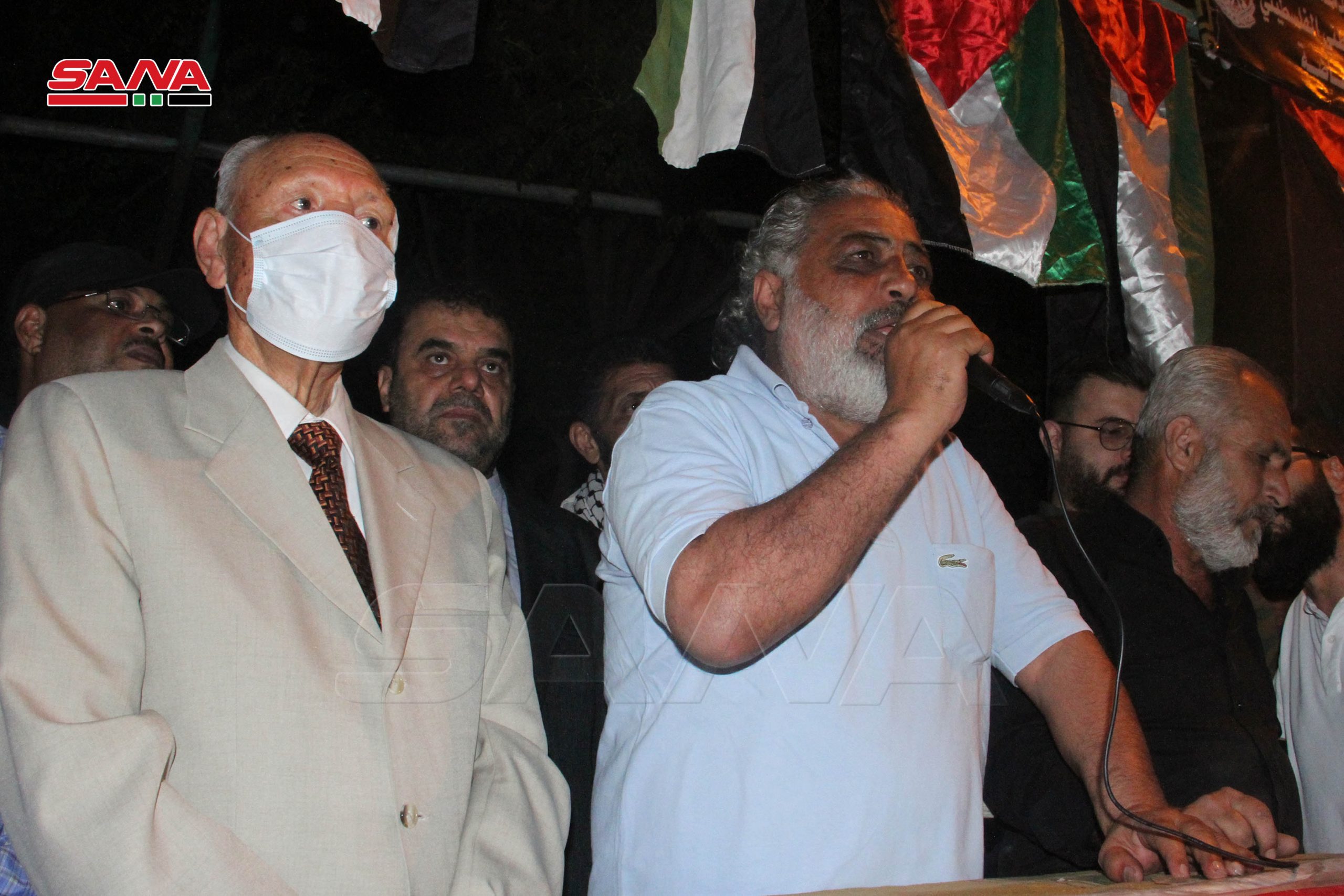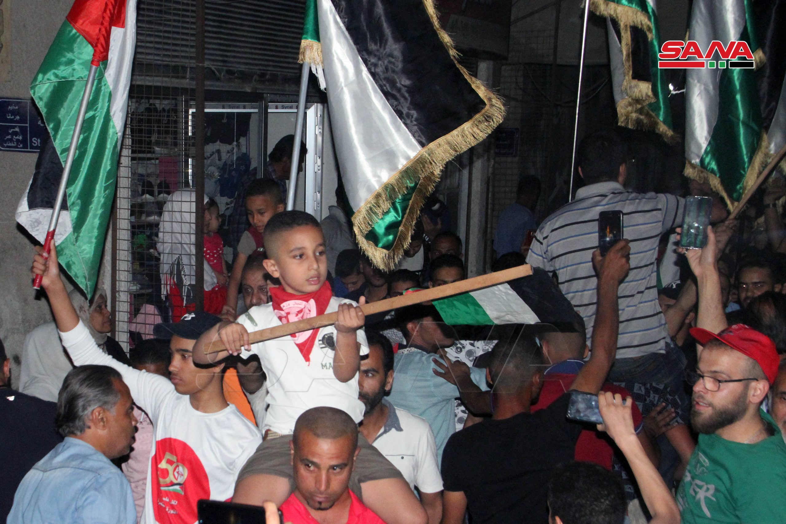 Una manifestación masiva en apoyo del pueblo palestino tuvo lugar en el campamento de Jarama para refugiados palestinos, cerca de la capital Damasco.