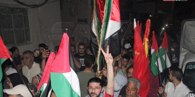 Los participantes en la marcha recorrieron las calles del campamento portando banderas sirias y palestinas, y pancartas con frases de solidaridad con el pueblo palestino en Jerusalén y Gaza.