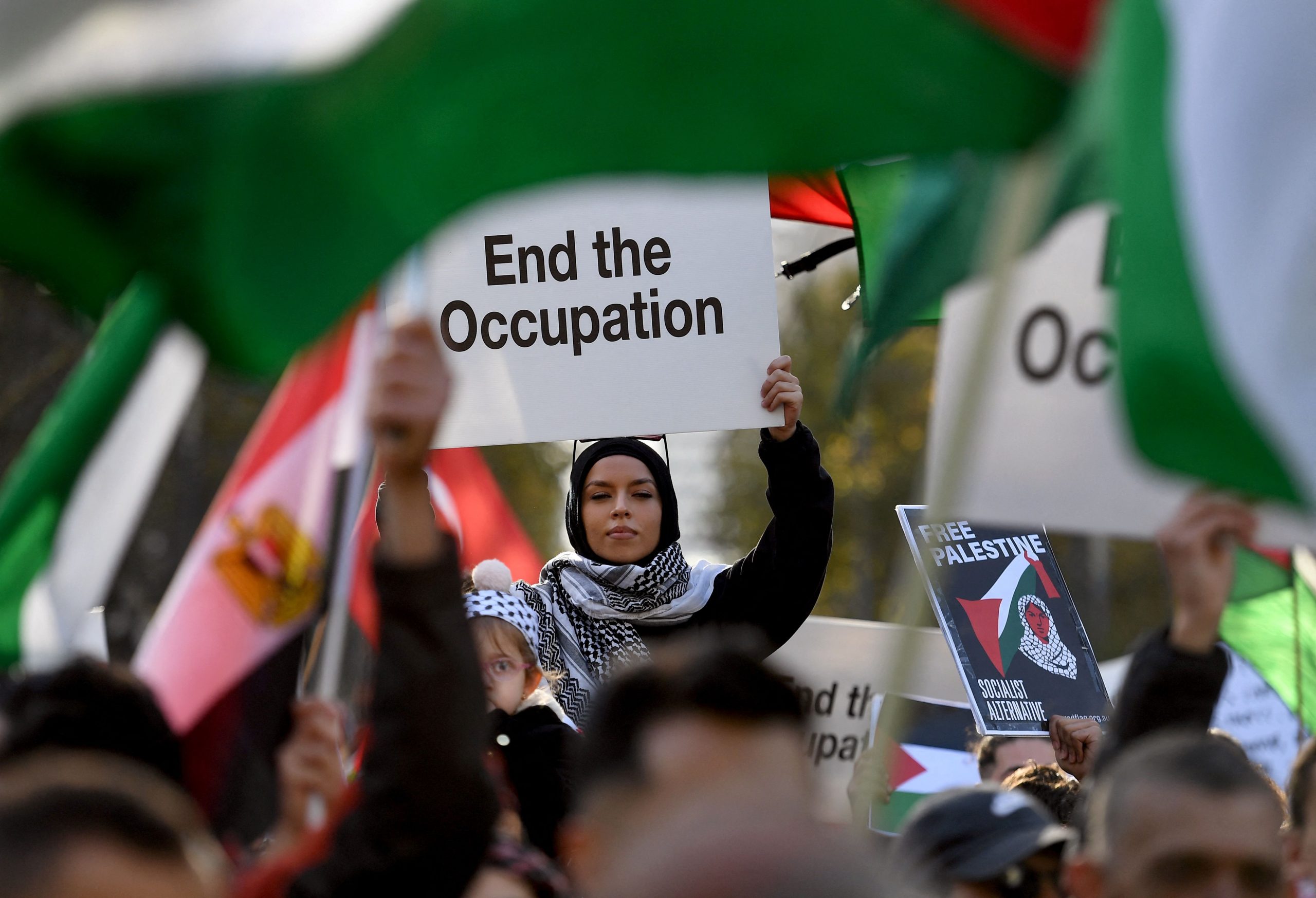 People hold placards as they take part in a protest rally in Melbourne on May 15, 2021, calling for an end to the escalating violence between Israel and the Palestinian Territories. / AFP / William WEST