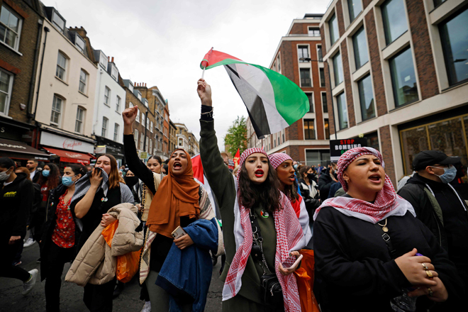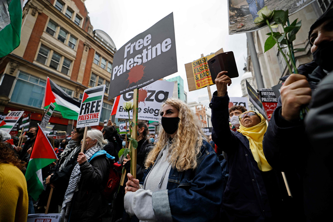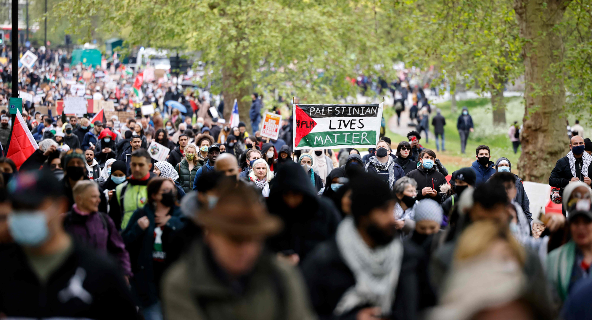 Mientras en la capital británica, Londres, tuvo lugar una manifestación masiva para condenar las acciones criminales de la ocupación israelí contra los palestinos.