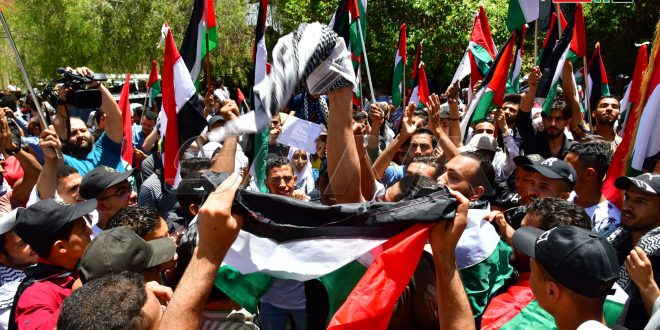 Las agrupaciones palestinas en Siria convocaron a una concentración palestinos frente a la sede de las Naciones Unidas en Damasco, en solidaridad con el pueblo palestino y contra la agresión israelí y sus masacres.