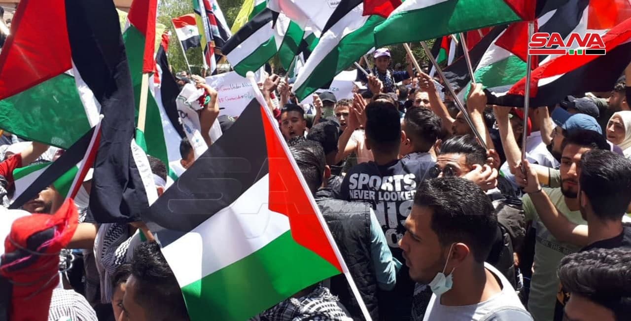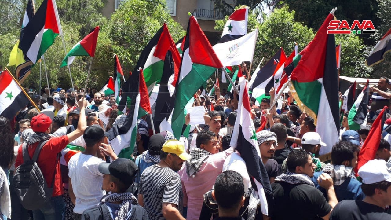 Los participantes en el acto portaban banderas y pancartas nacionales de Siria y Palestina, y reiteraron el apoyo y solidaridad con el pueblo palestino ante los ataques brutales del ocupante israelí.