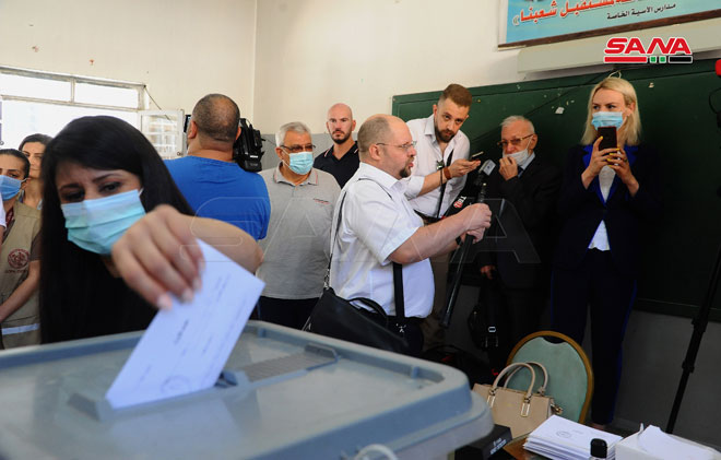 Parlamentarios y periodistas de varios países asisten al proceso de votación en varias urnas en la capital Damasco para estar al tanto de la marcha de esta cita