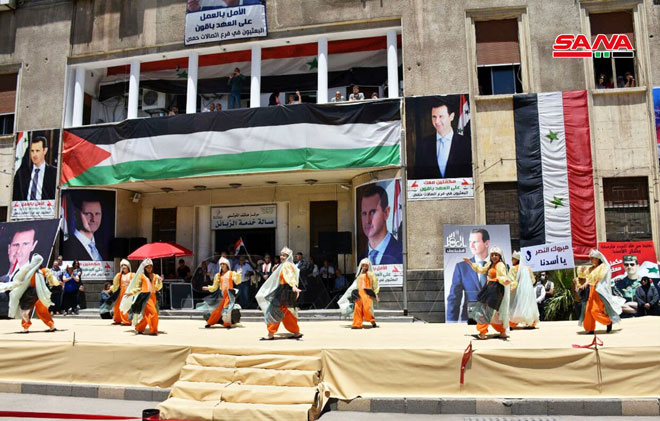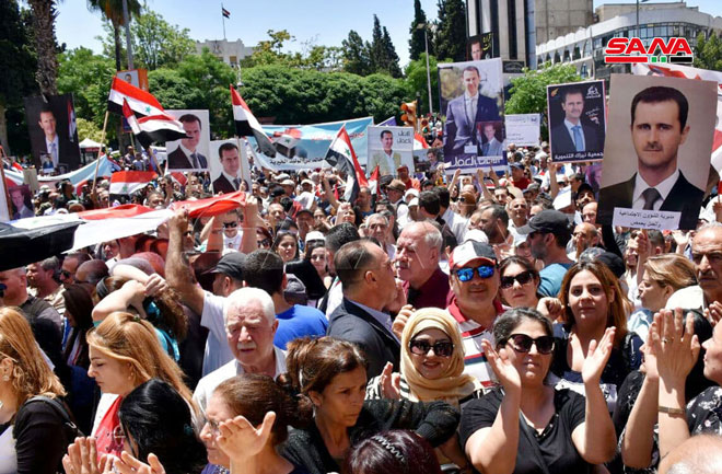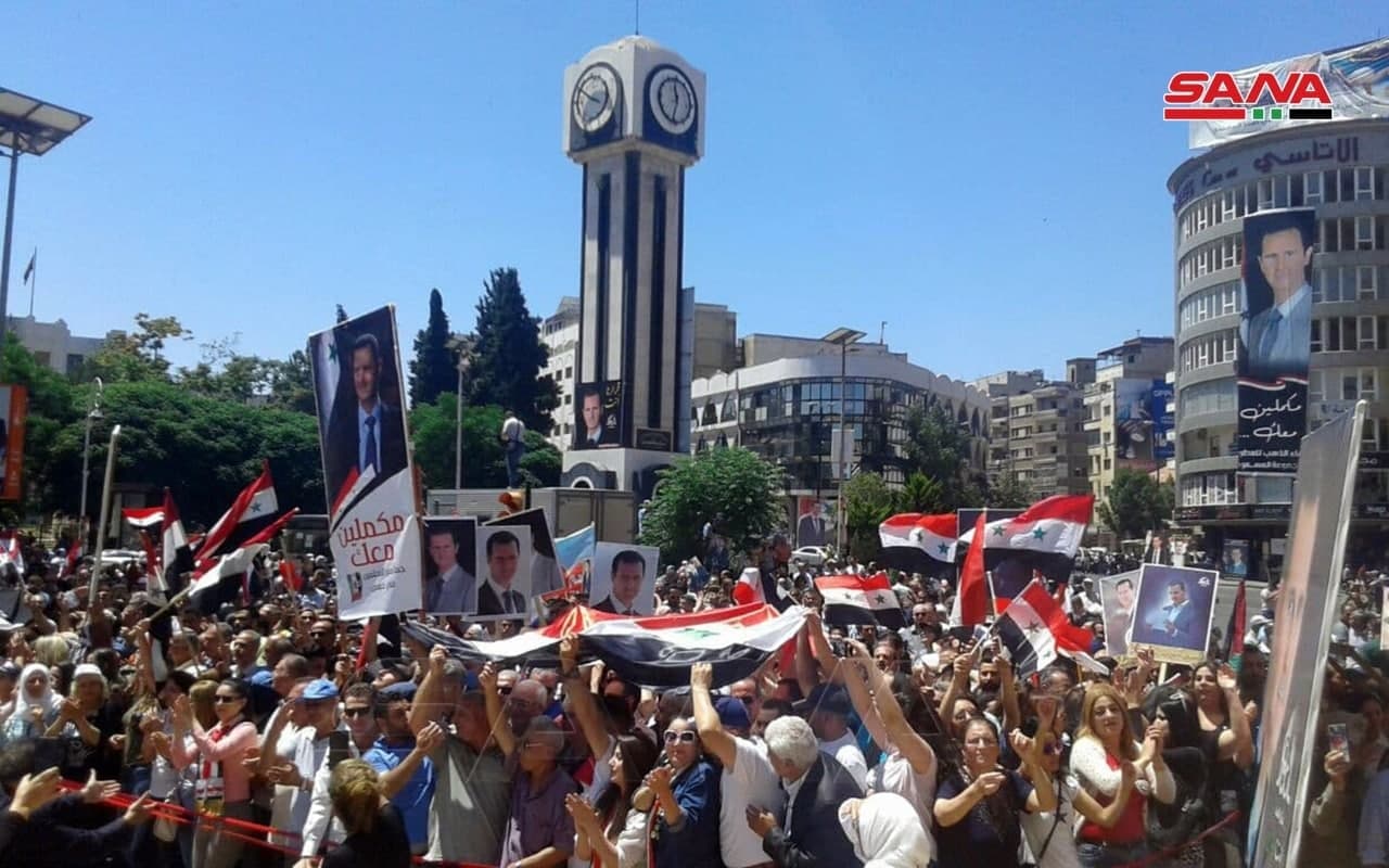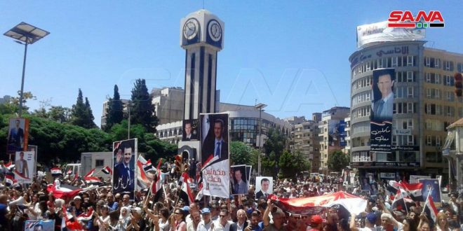 La Plaza del Nuevo Reloj en la ciudad central de Homs fue escenario de una masiva manifestación para celebrar el triunfo del Dr. Bashar al-Assad en las elecciones presidenciales.