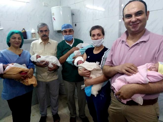 La Sra. Nora Ibrahim, de la aldea de al-Shiha en el municipio de Messiaf en el oeste de la provincia de Hama, dio a luz hoy a quintillizos.
