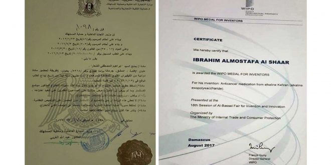 El investigador al-Shaar obtuvo una patente registrada en Siria en 2017 en la Organización Mundial para la Protección de la Propiedad Intelectual “OMPI” y la aprobación del Ministerio de Salud sirio en 2016 para su invención de una sustancia medicinal anticancerígena de “kéfir alcalino”.