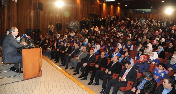 La Unión de los Jóvenes Revolucionarios Sirios organizó este martes un mitin con el vicecanciller, Dr. Faisal al-Mekdad en la Biblioteca de Assad en Damasco para enfatizar el papel de los jóvenes sirios en la defensa del país y la construcción de su futuro.