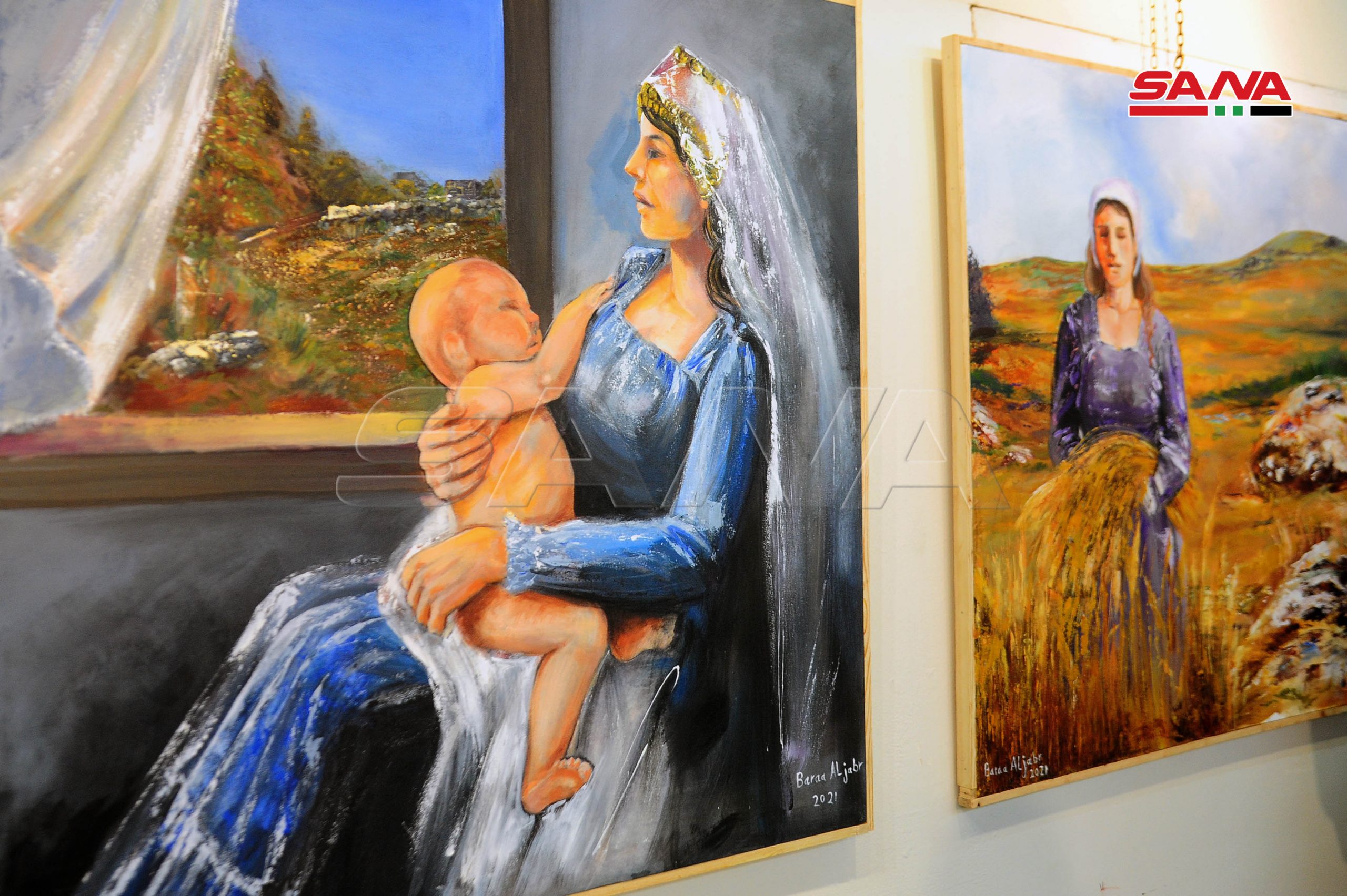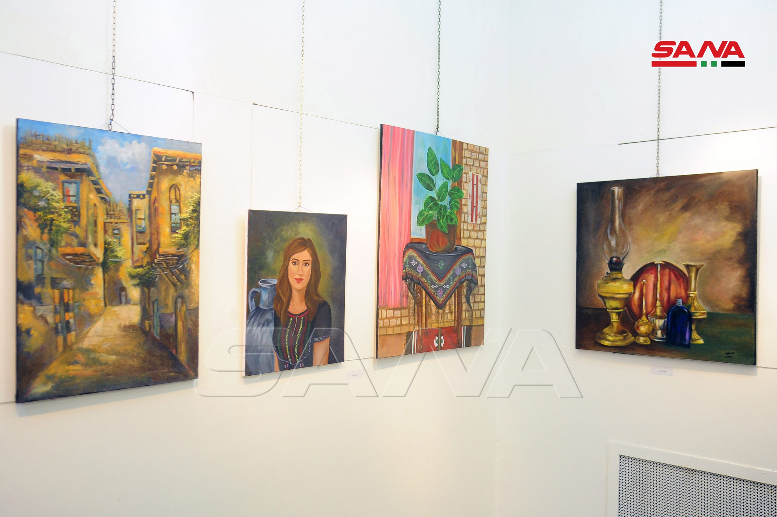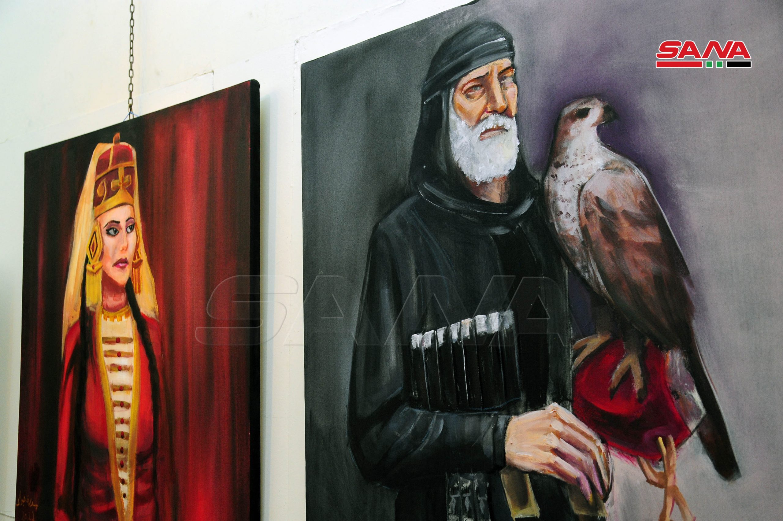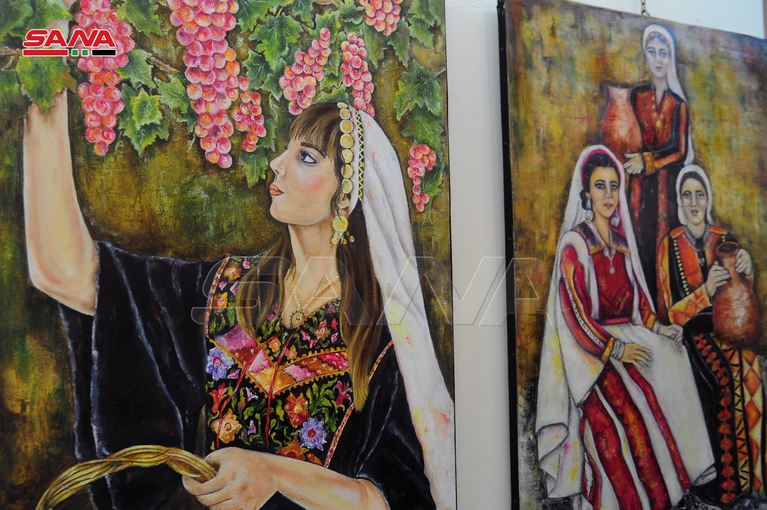 Más de 30 obras de artistas profesionales se exhiben y su tema es el patrimonio sirio y sus símbolos populares.