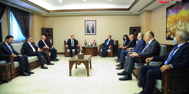 El ministro de Exteriores y Expatriados, Faisal al-Mekdad, repasó hoy con el ministro de Industria y Minerales iraquí, Manhal Aziz Al-Khabbaz, las formas y perspectivas para desarrollar las relaciones bilaterales y la cooperación industrial entre los dos países.