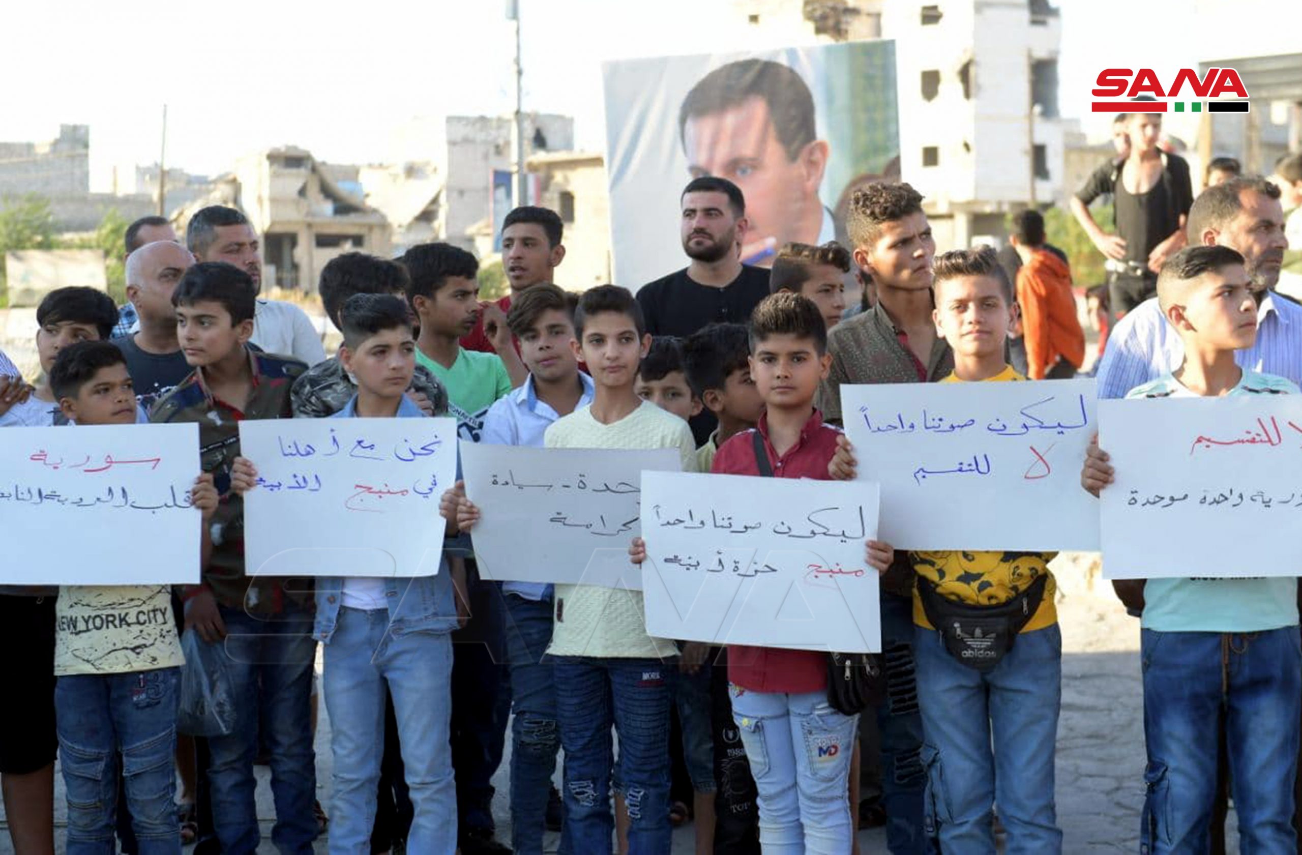 Los residentes del barrio Tariq al-Bab, liberado del terrorismo, y los clanes de Alepo organizaron un mitín de solidaridad con la población de la ciudad de Manbij que enfrenta las prácticas criminales de la milicia Fuerzas Democráticas de Siria (FDS) y en rechazo a las ocupaciones de EE.UU y Turquía de partes del territorio nacional.