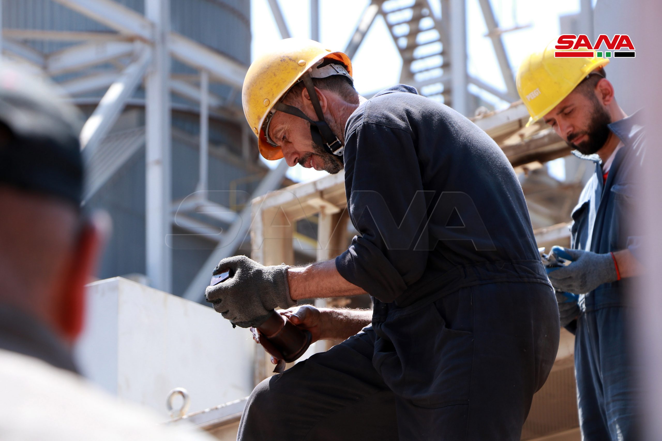 Con experiencias nacionales, los técnicos y trabajadores de la Central Eléctrica de Jandar en la provincia central de Homs realizan trabajos de rehabilitación y mantenimiento de la tercera turbina de gas que tiene una capacidad de 145 megavatios.