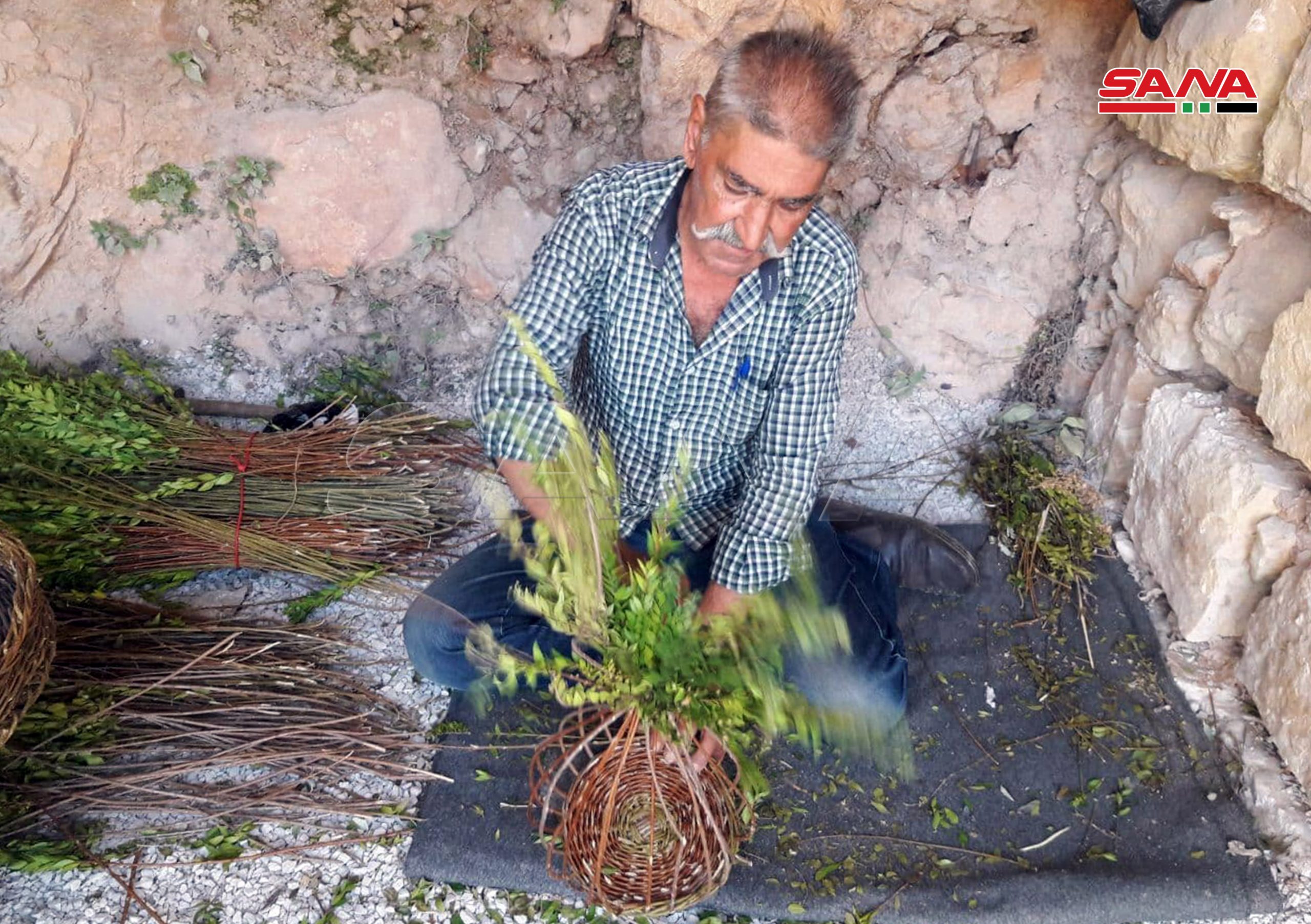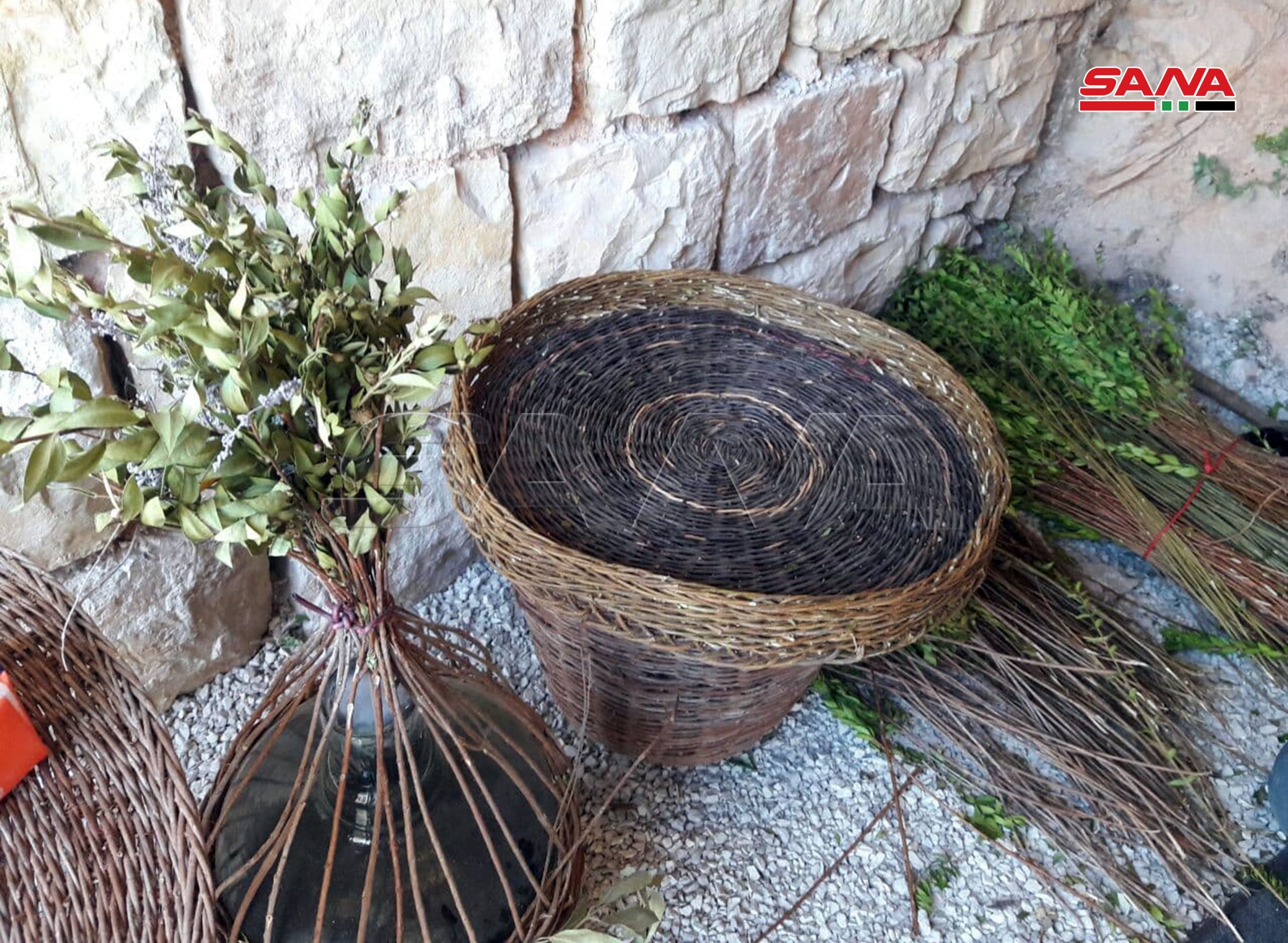El agricultor veterano, Shehadi Aneed, de 60 años de edad, oriundo de Wadi al-Nadara en la provincia siria de Homs, convierte los ramos pequeñas de laurel en cestas tradicionales donde las exhibe en la exposición de productos patrimoniales en el Festival del Castillo y el Valle en Homs.