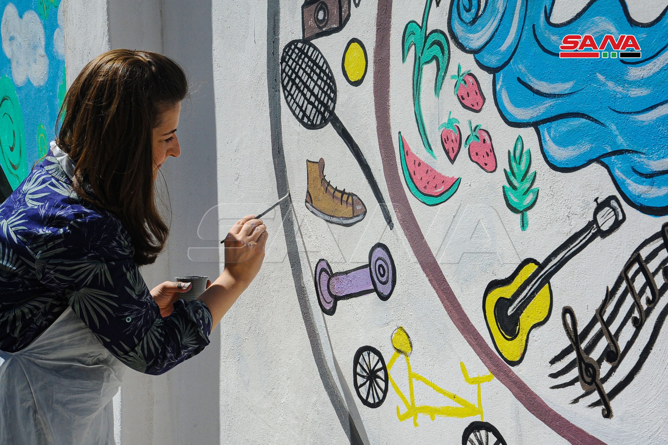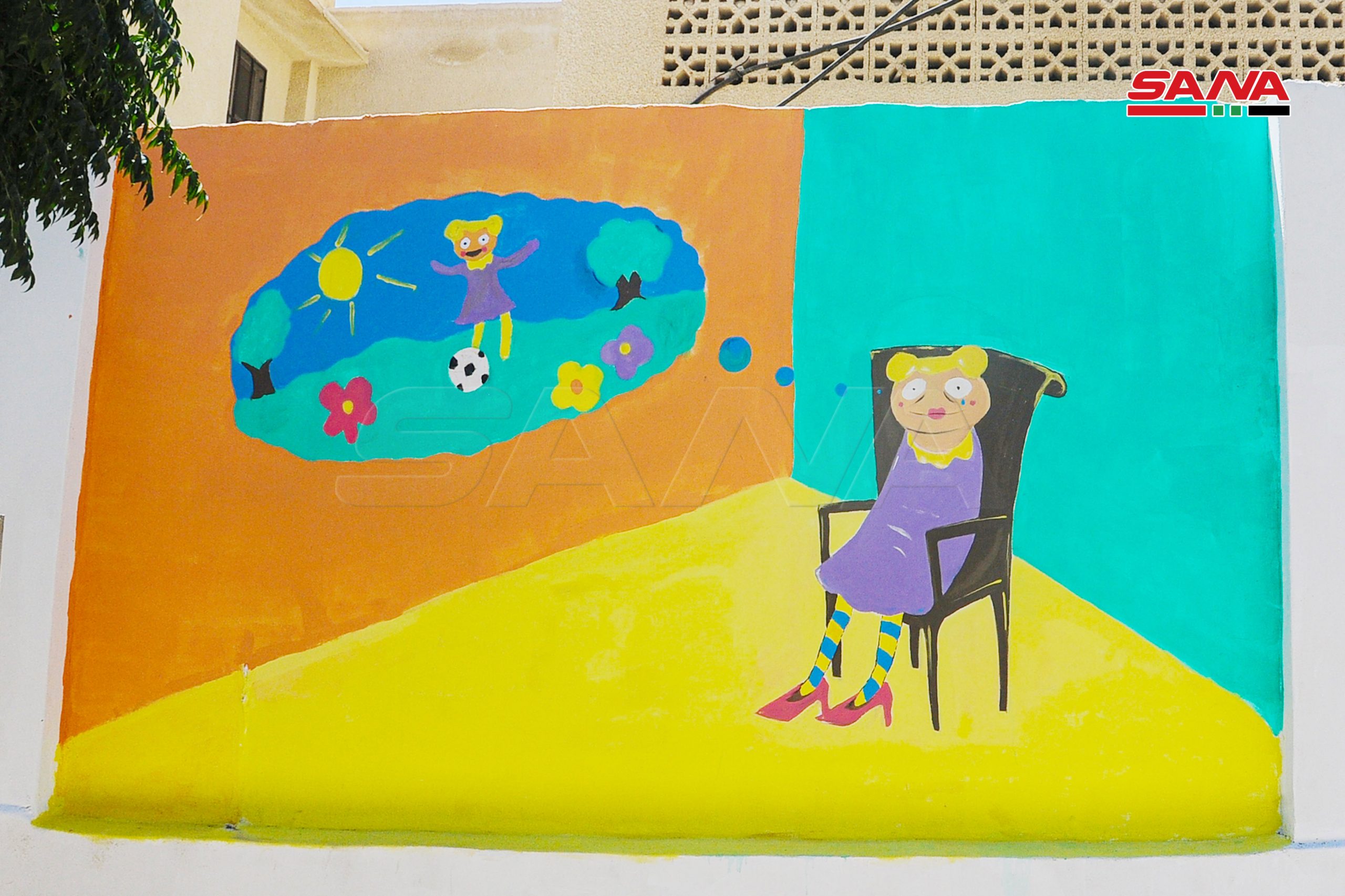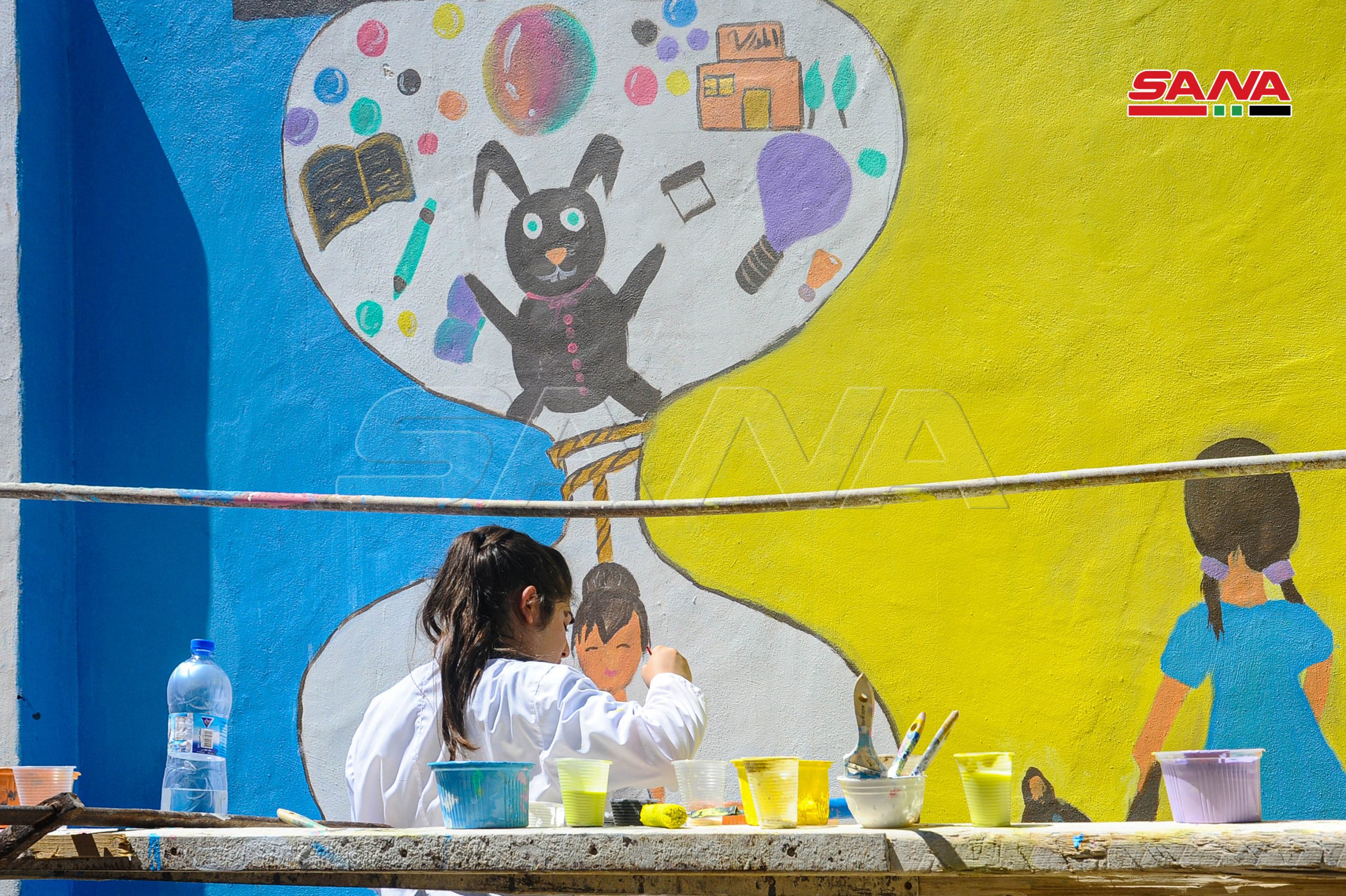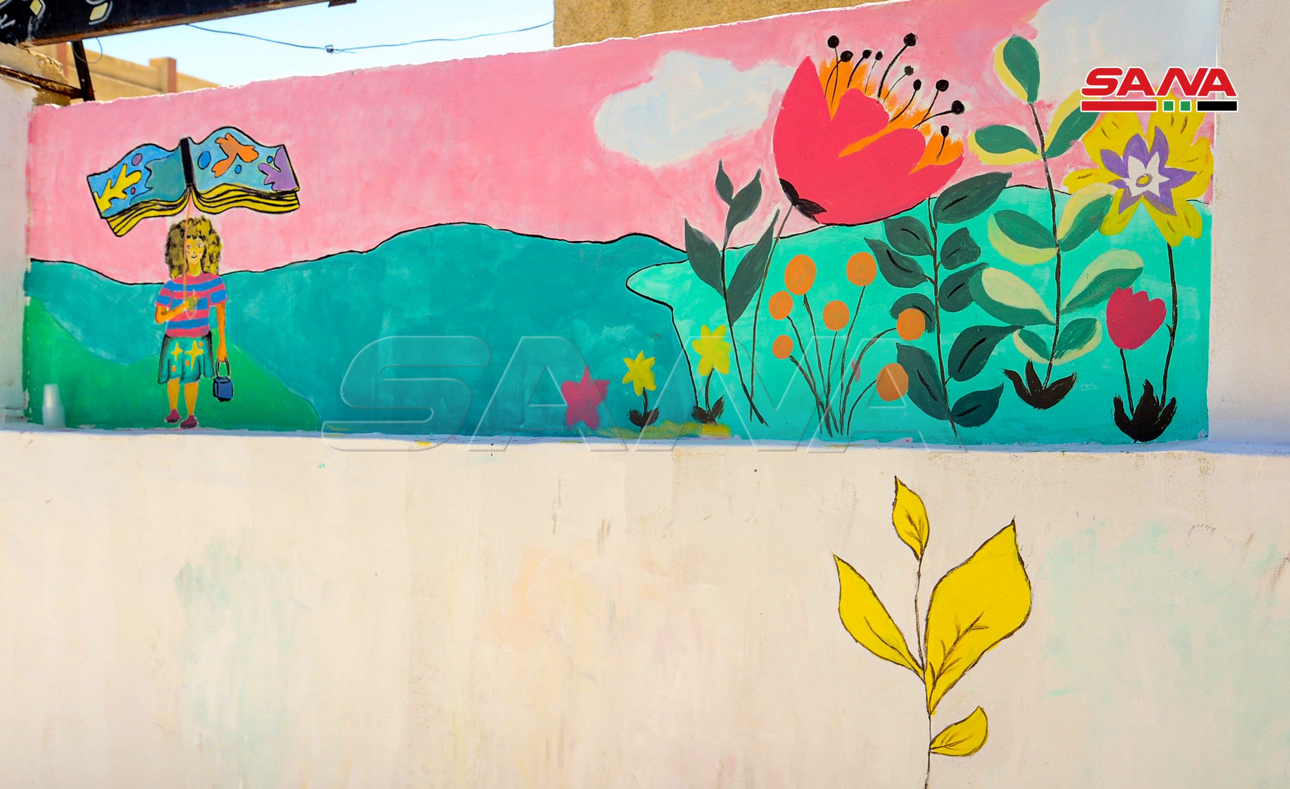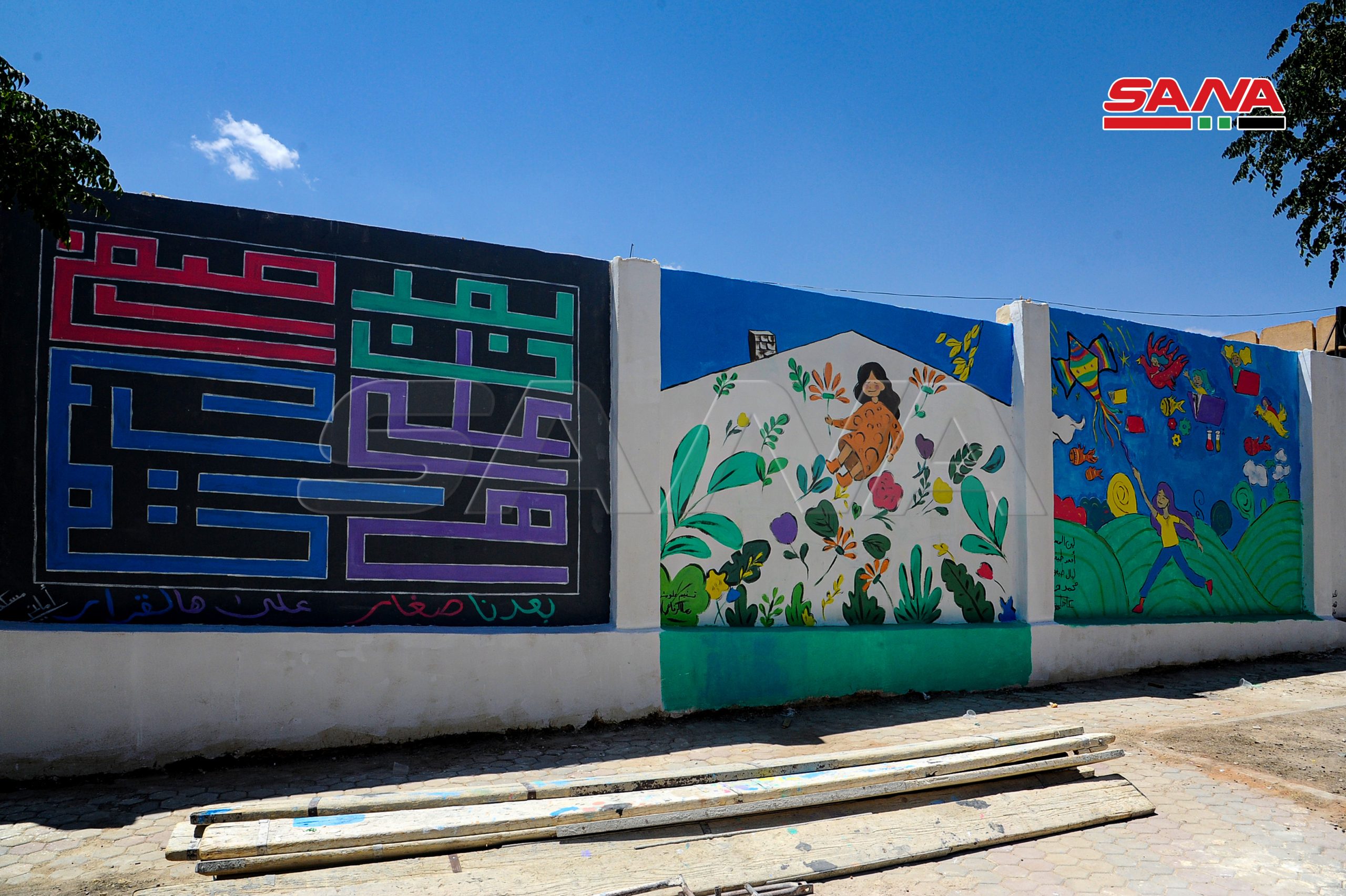 Los dibujantes llenaron con sus pinturas relacionados al tema los muros de la escuela secundaria ” el mártir Muhammad Mohsen Raya” en la ciudad de Nabek , a unos 80 kilómetros al norte de Damasco .