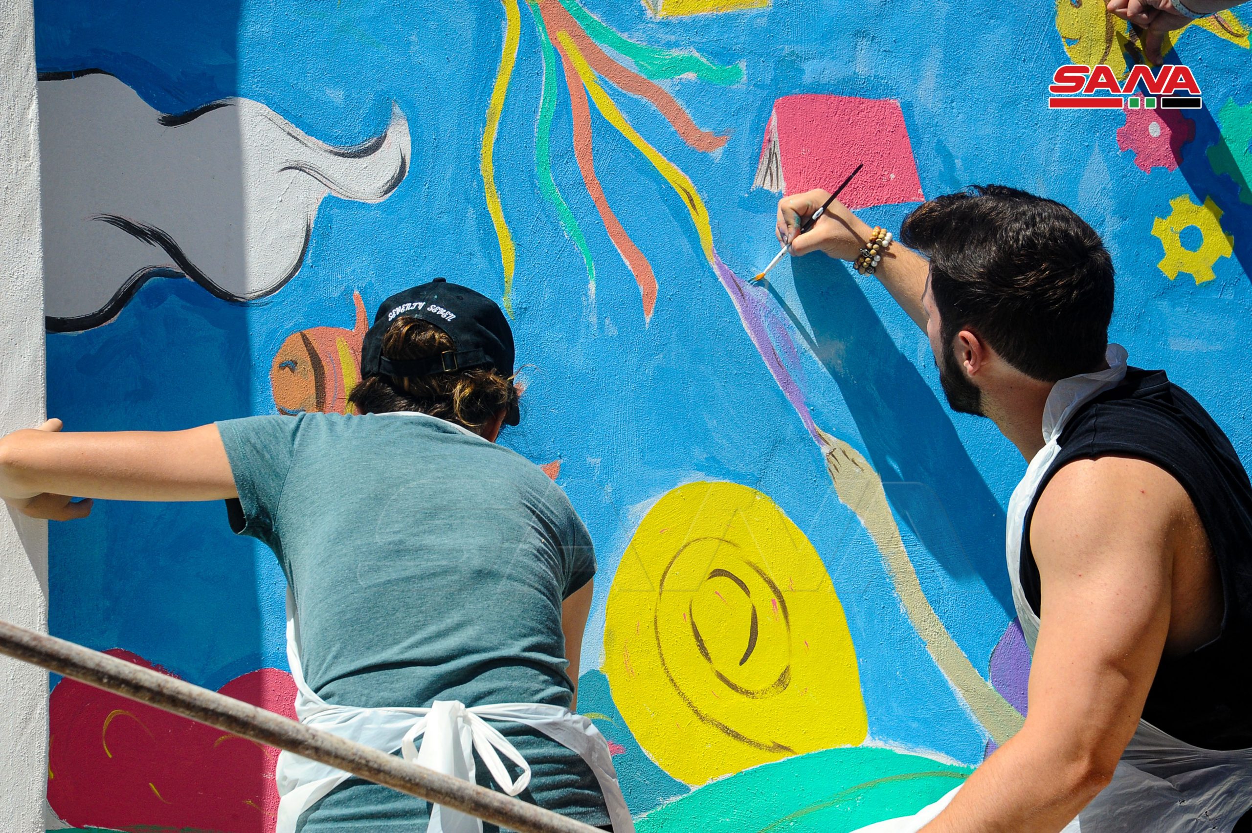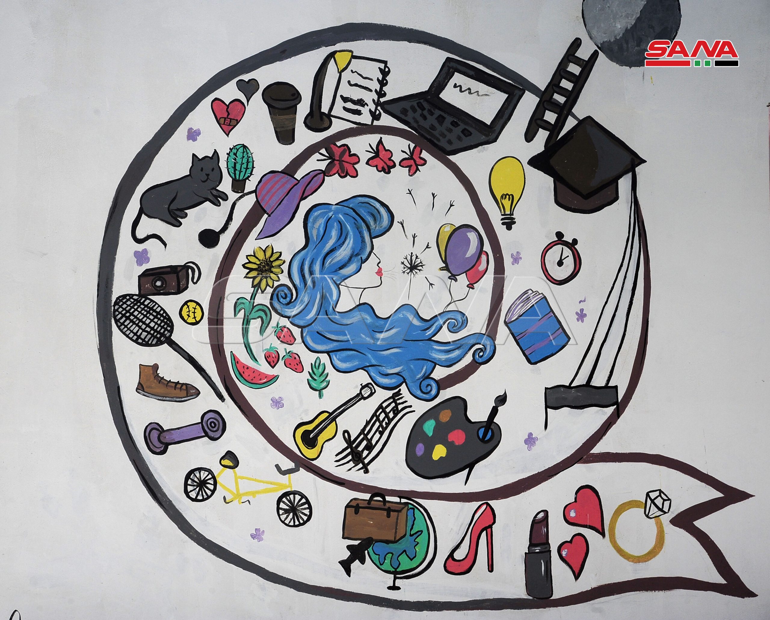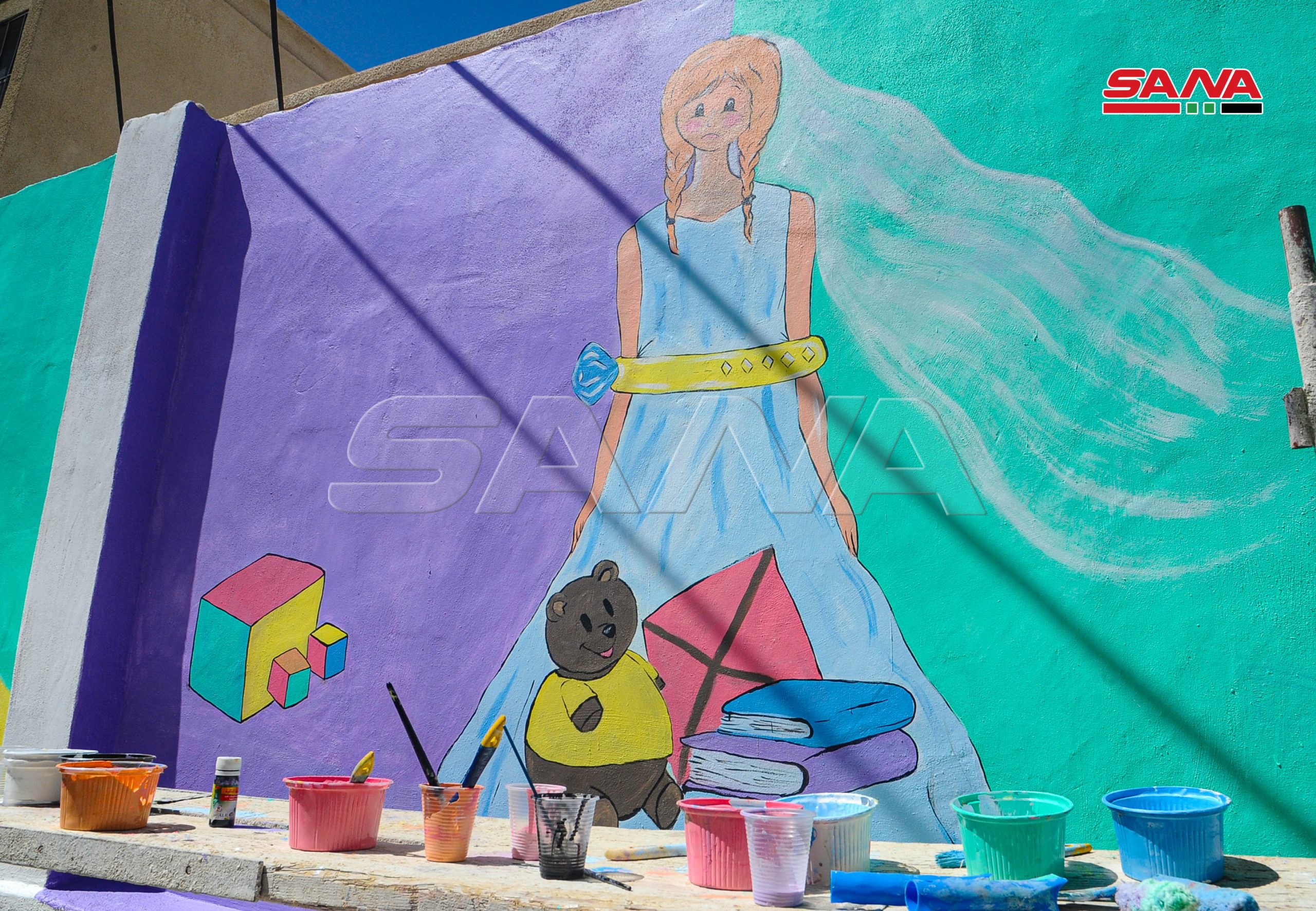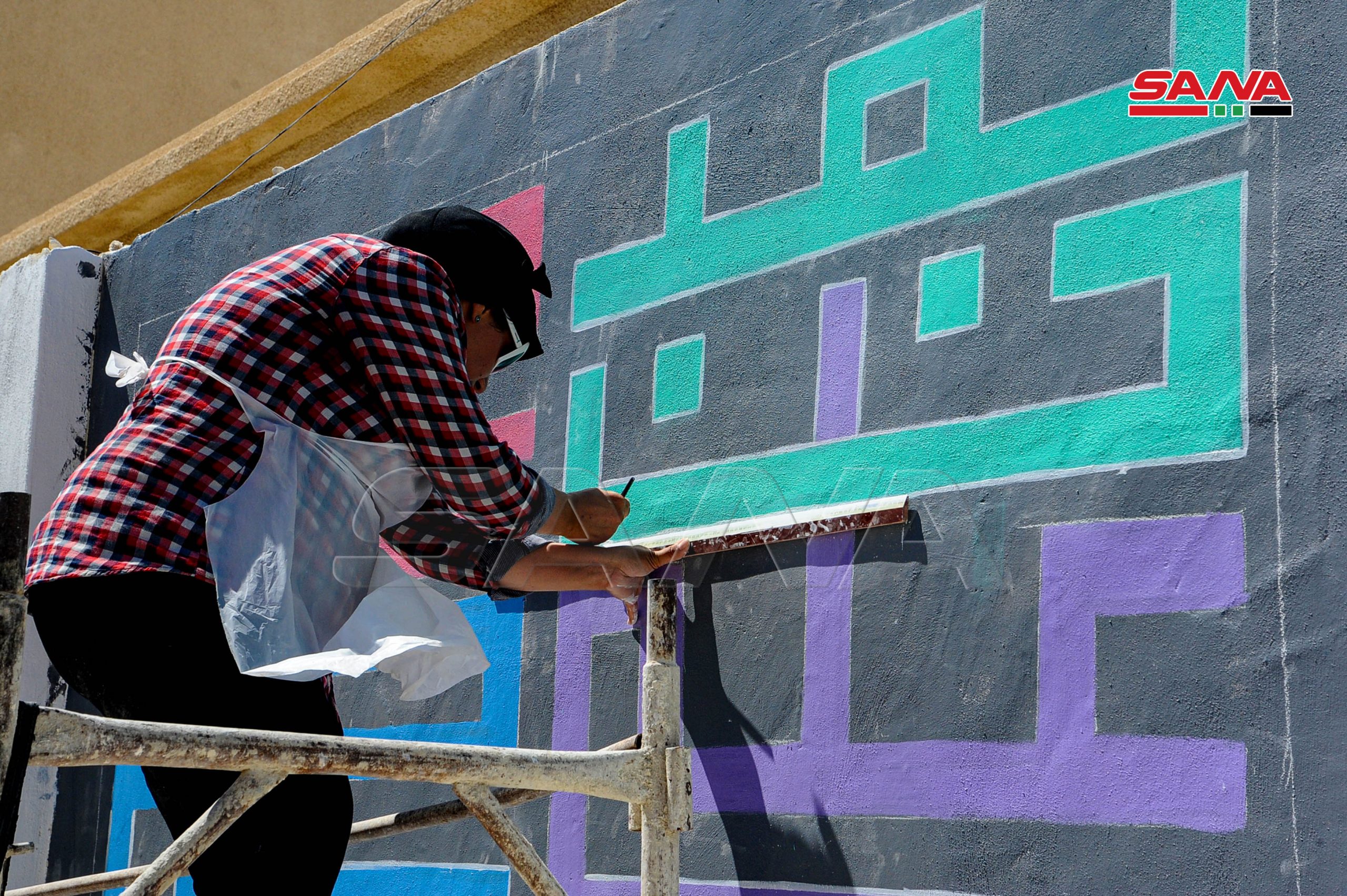 Los dibujantes llenaron con sus pinturas relacionados al tema los muros de la escuela secundaria ” el mártir Muhammad Mohsen Raya” en la ciudad de Nabek , a unos 80 kilómetros al norte de Damasco .