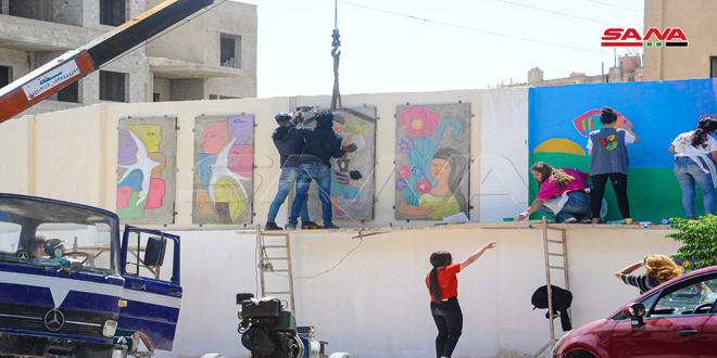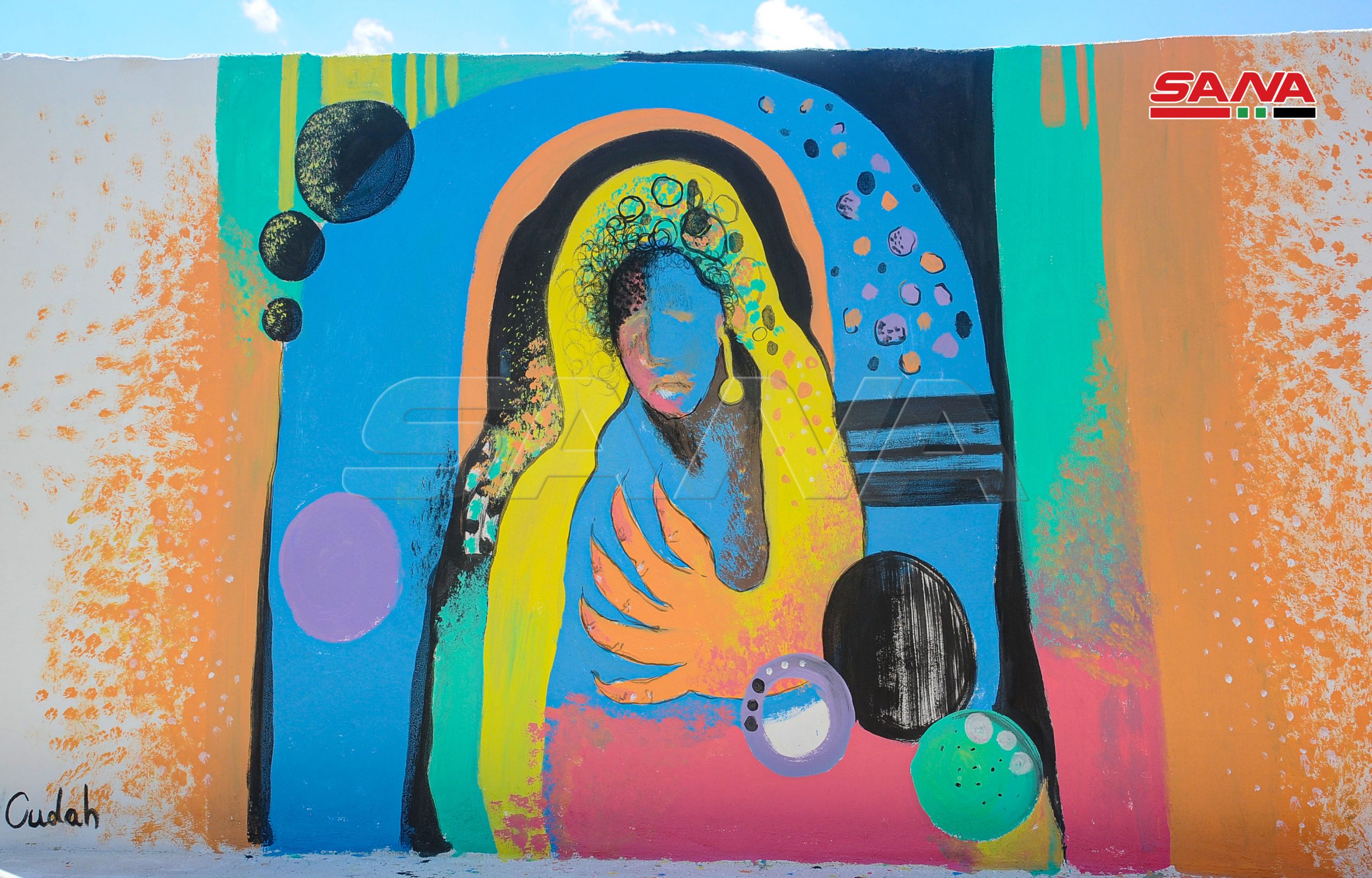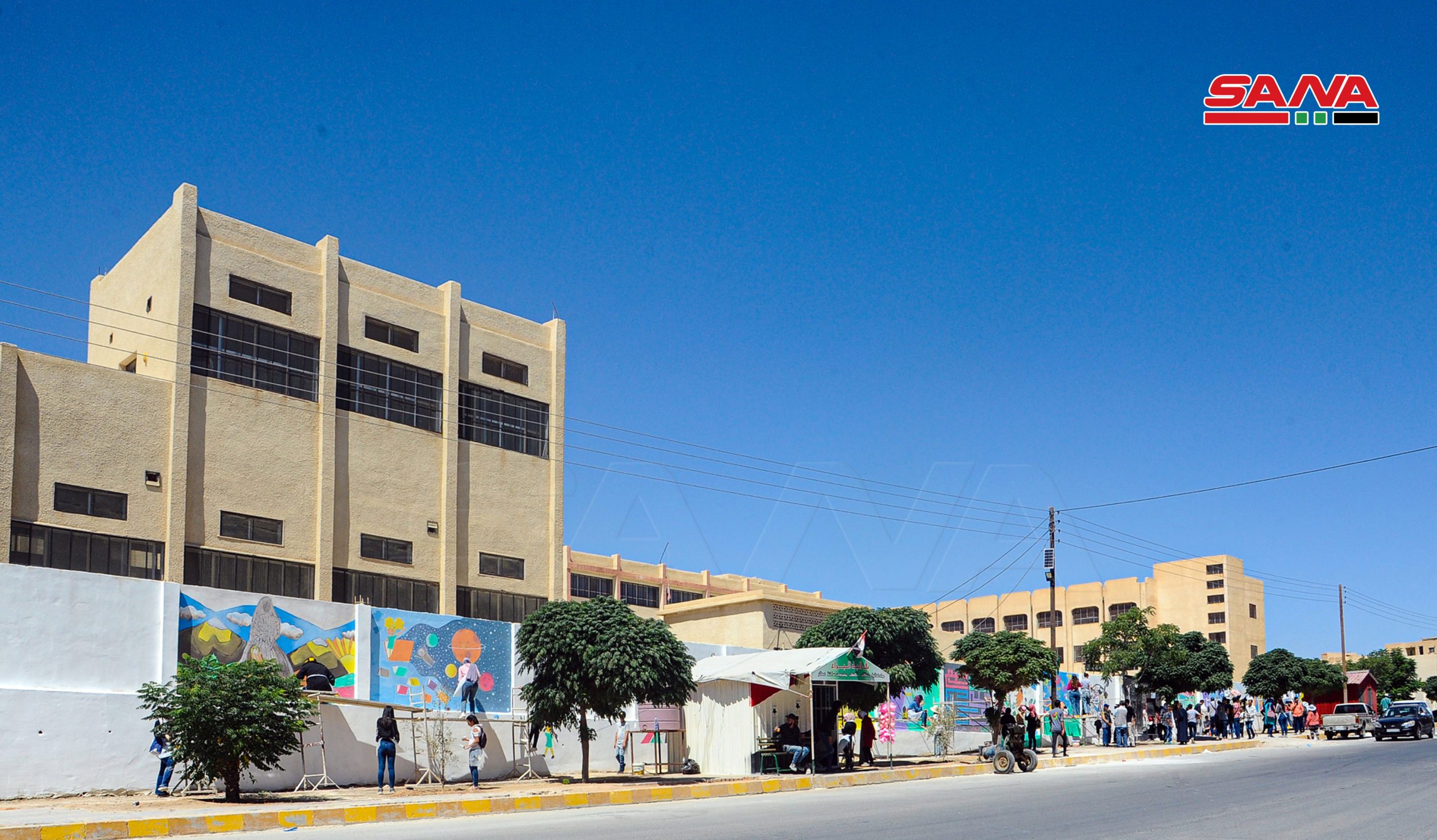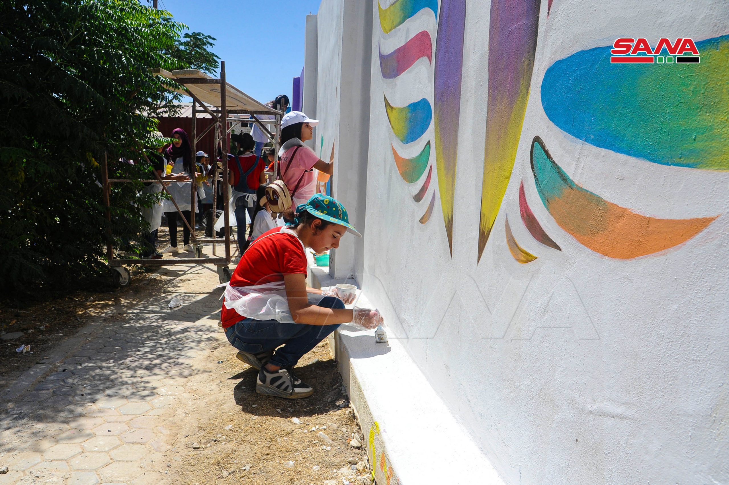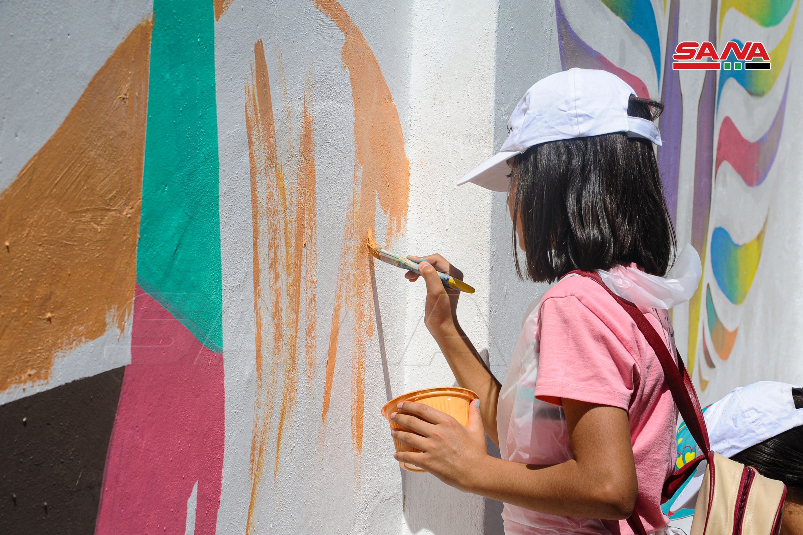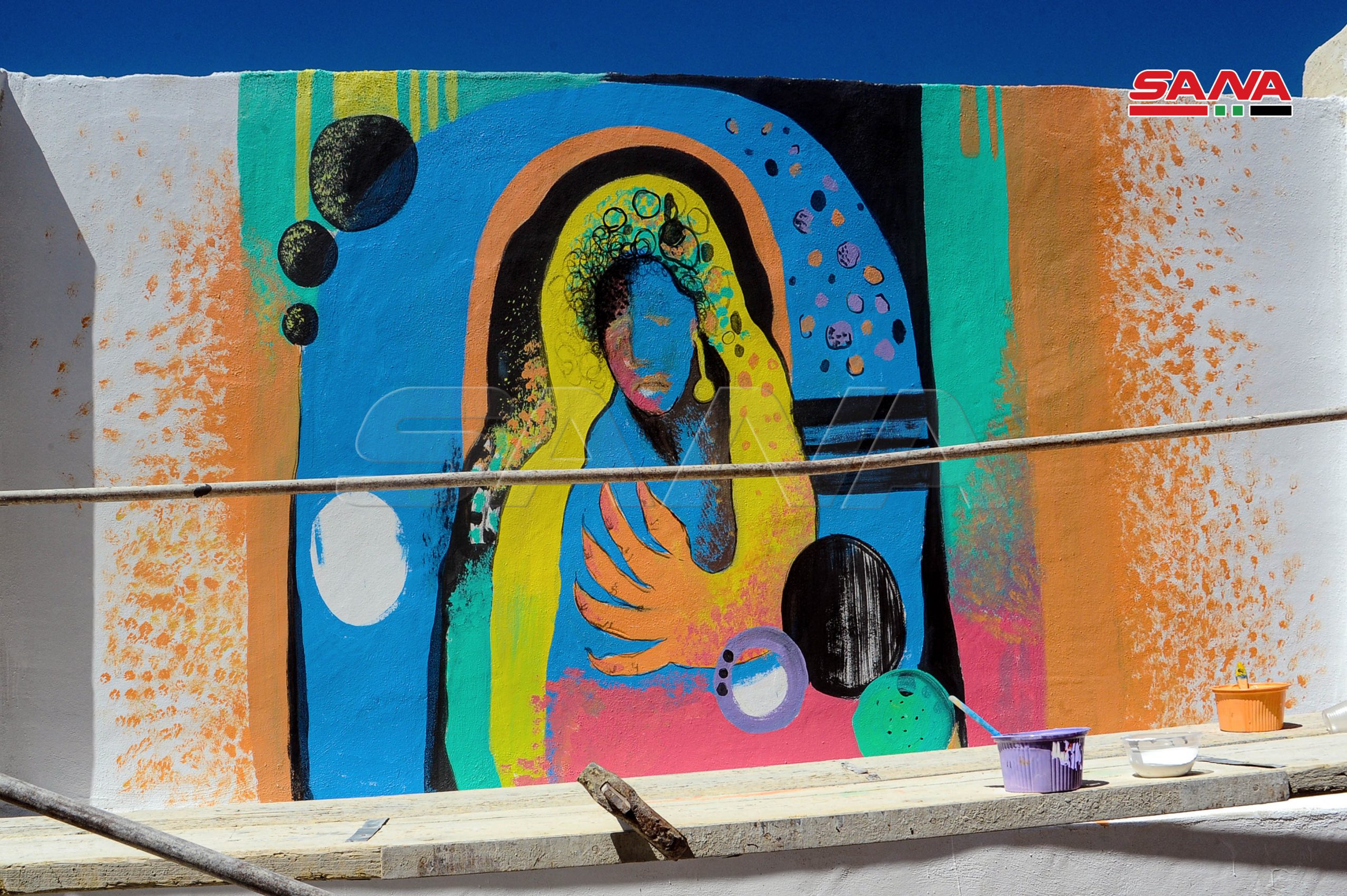 Los dibujantes llenaron con sus pinturas relacionados al tema los muros de la escuela secundaria ” el mártir Muhammad Mohsen Raya” en la ciudad de Nabek , a unos 80 kilómetros al norte de Damasco .