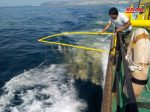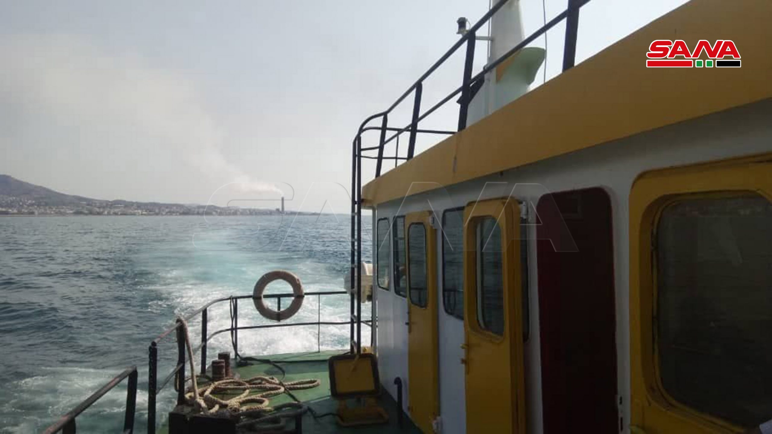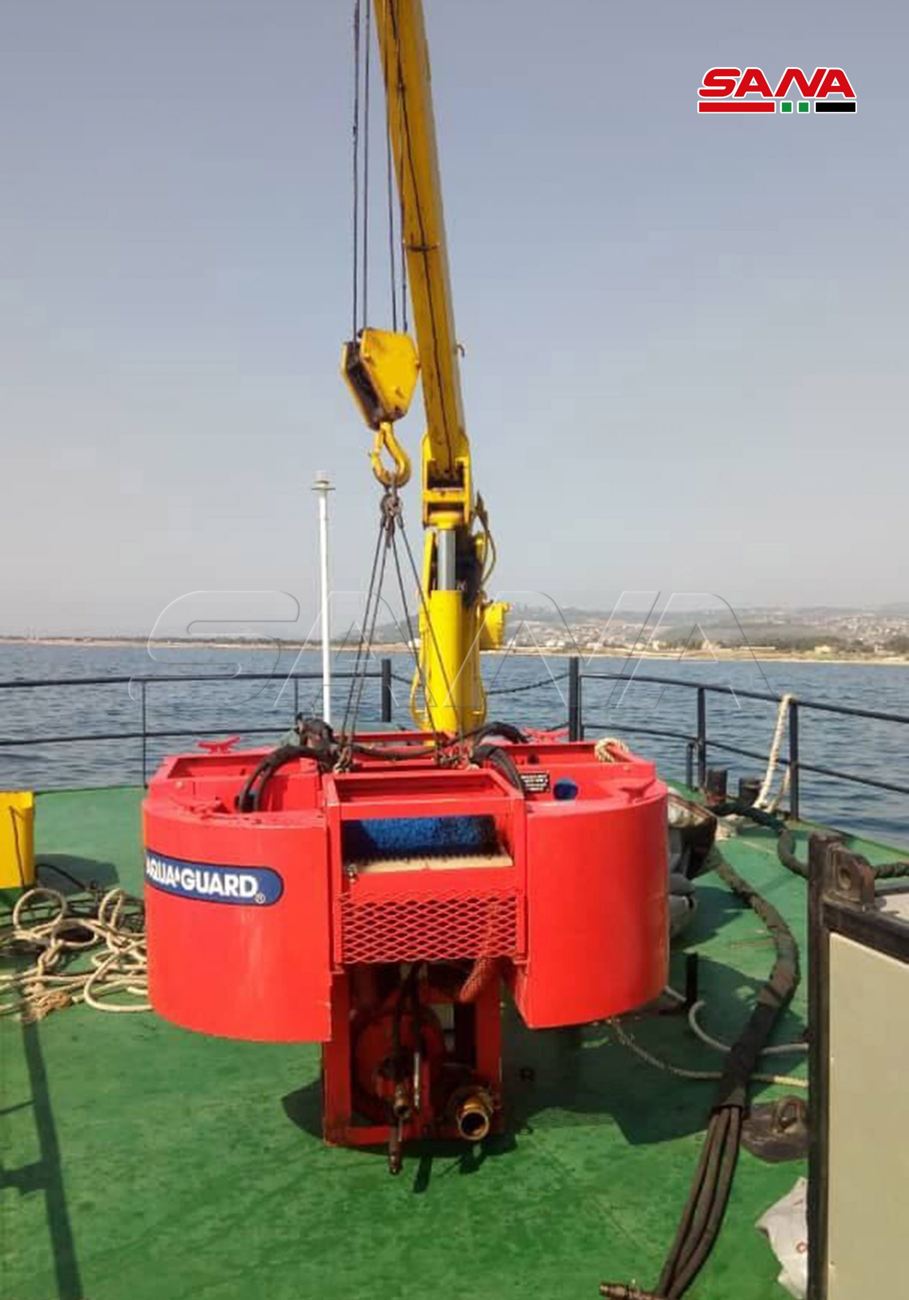 La embarcación Bousra el Cham participa en las operaciones de descontaminación de la costa siria tras la fuga de combustible de uno de los tanques de la termoeléctrica en la ciudad portuaria de Banias.
