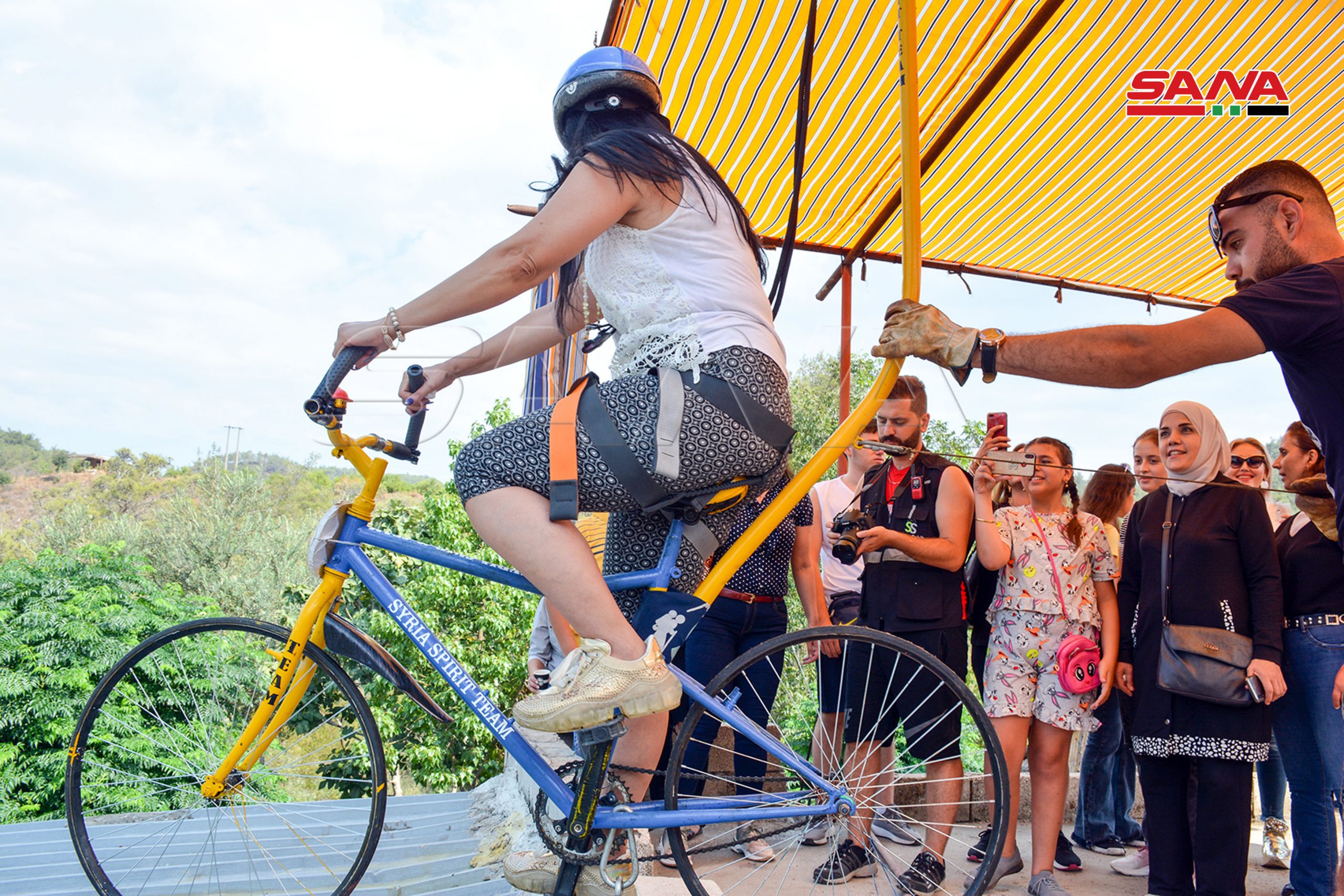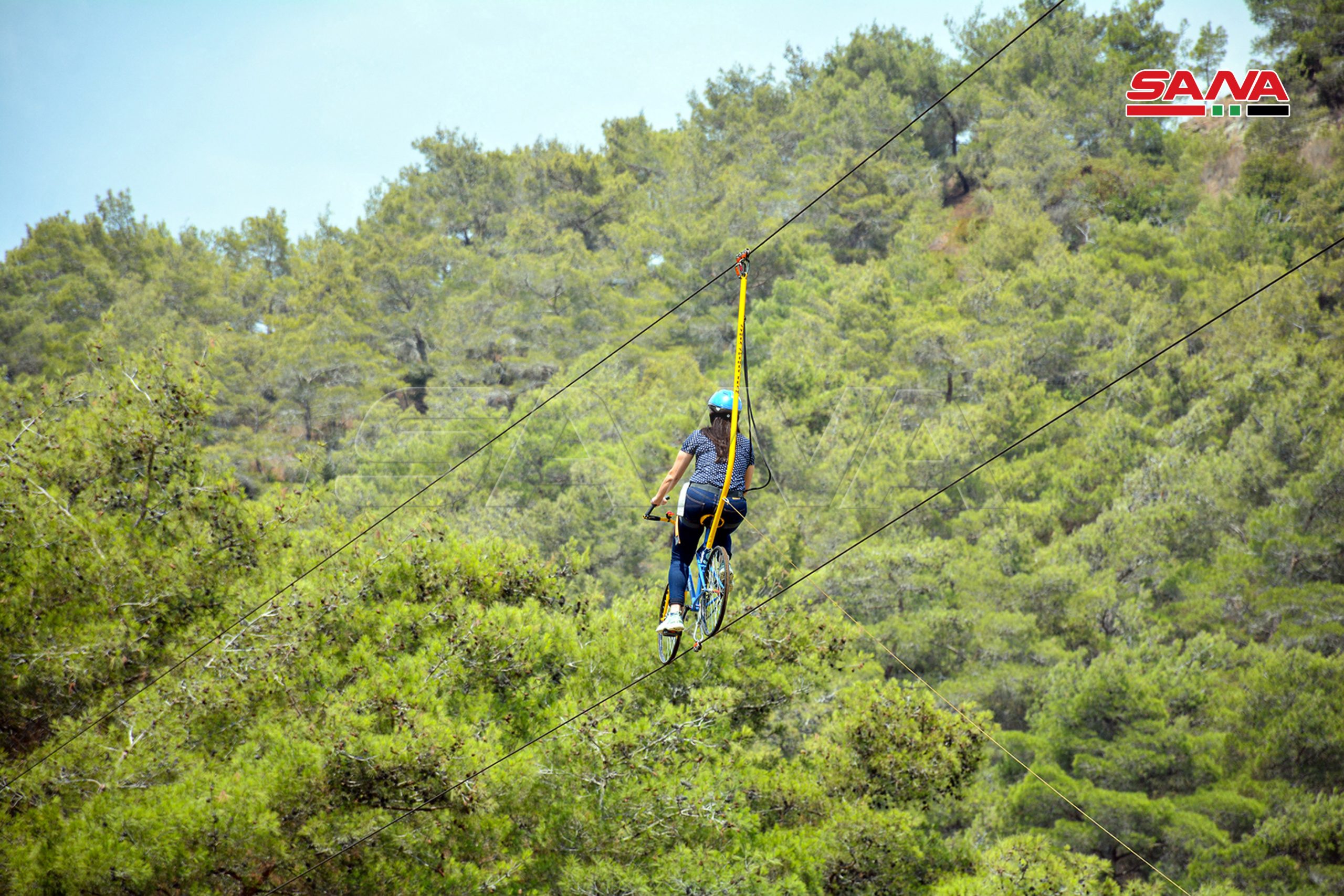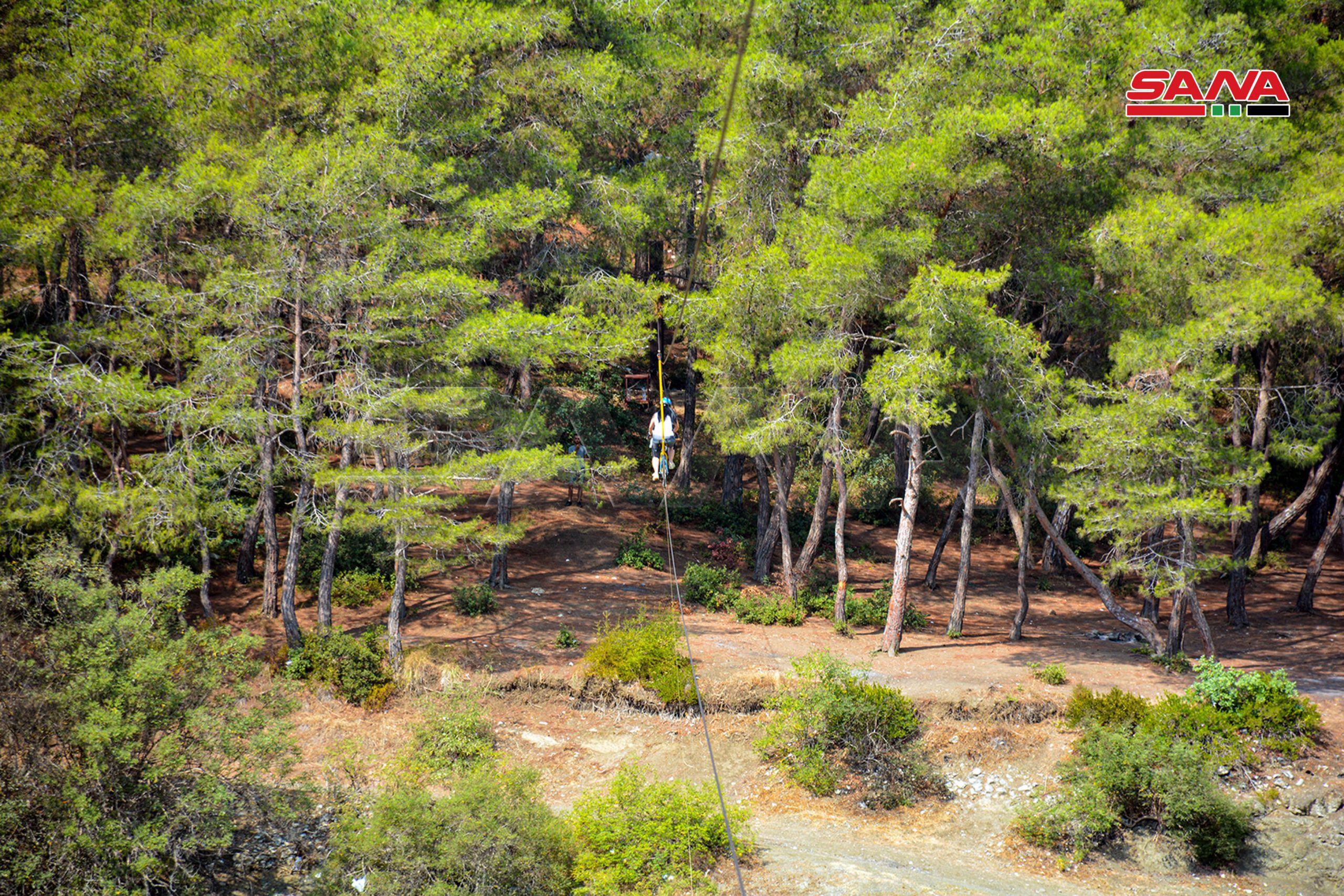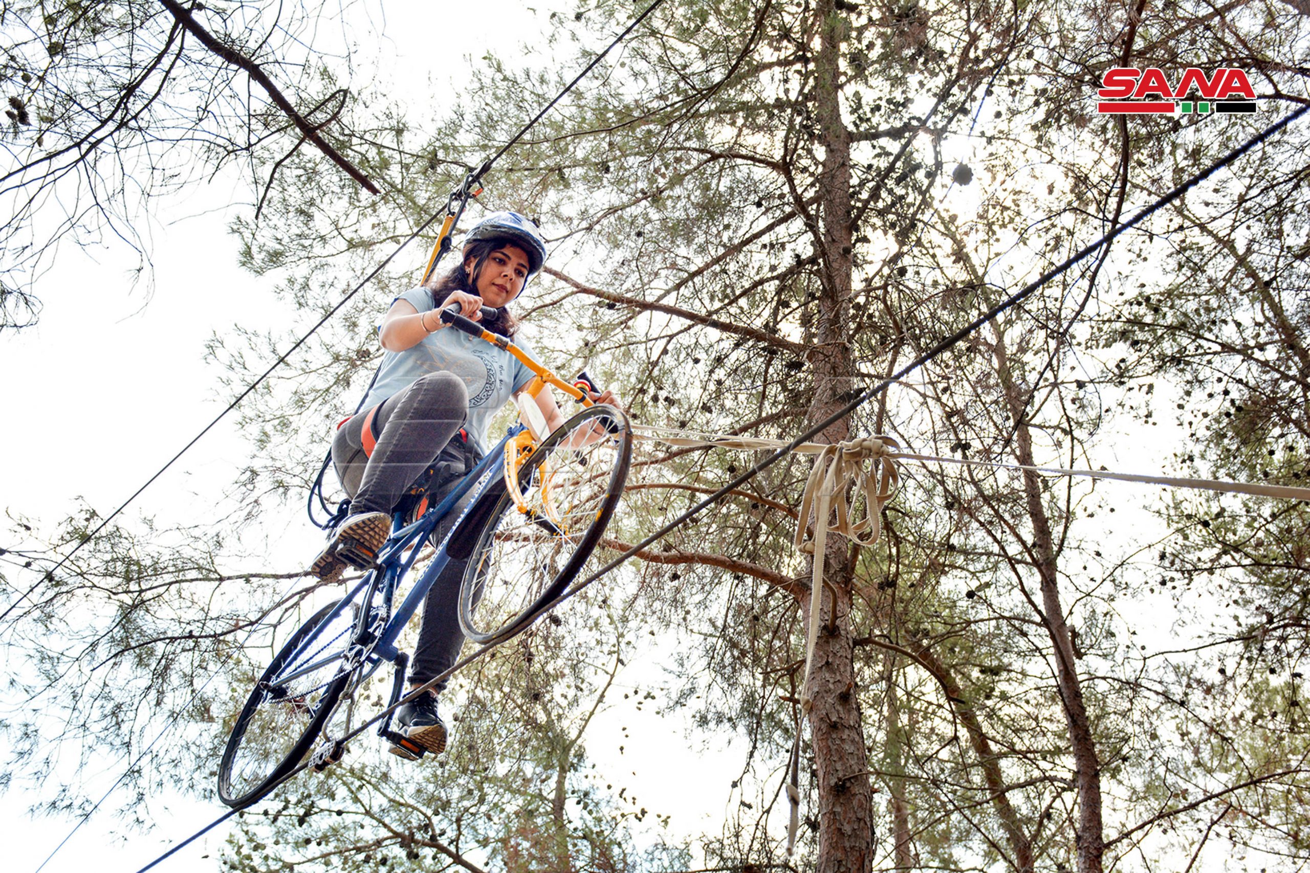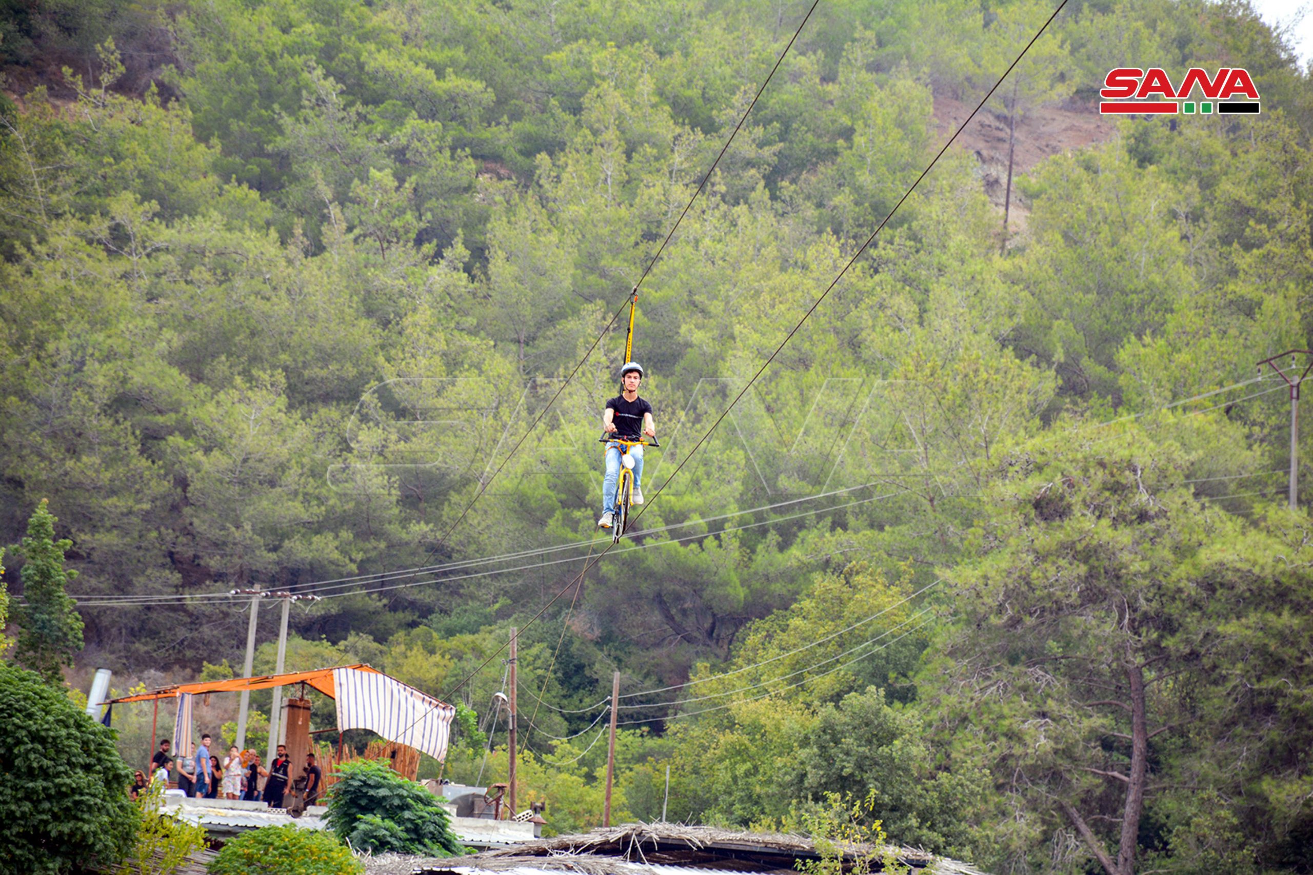 El proyecto, implementado por un grupo de jóvenes sirios en la localidad de al-Tariqiah en el norte de Latakia, brinda una experiencia considerada la primera de su tipo en Siria y la región, ya que permite a los amantes del ciclismo y de la aventura y la pasión disfrutar de un recorrido corto por un sendero de 250 metros, incluidos 40 metros, dentro de un bosque de pinos a una altura de 40 metros.