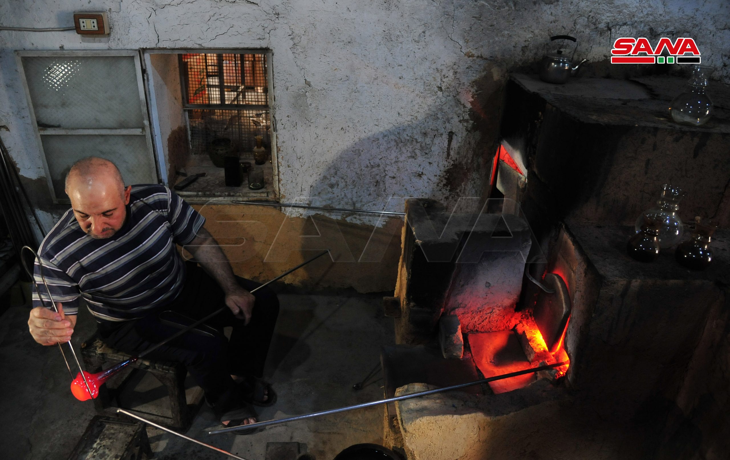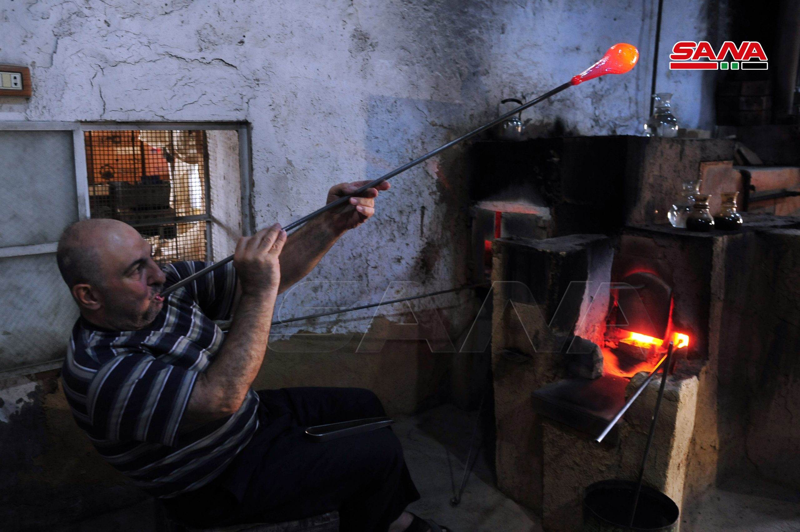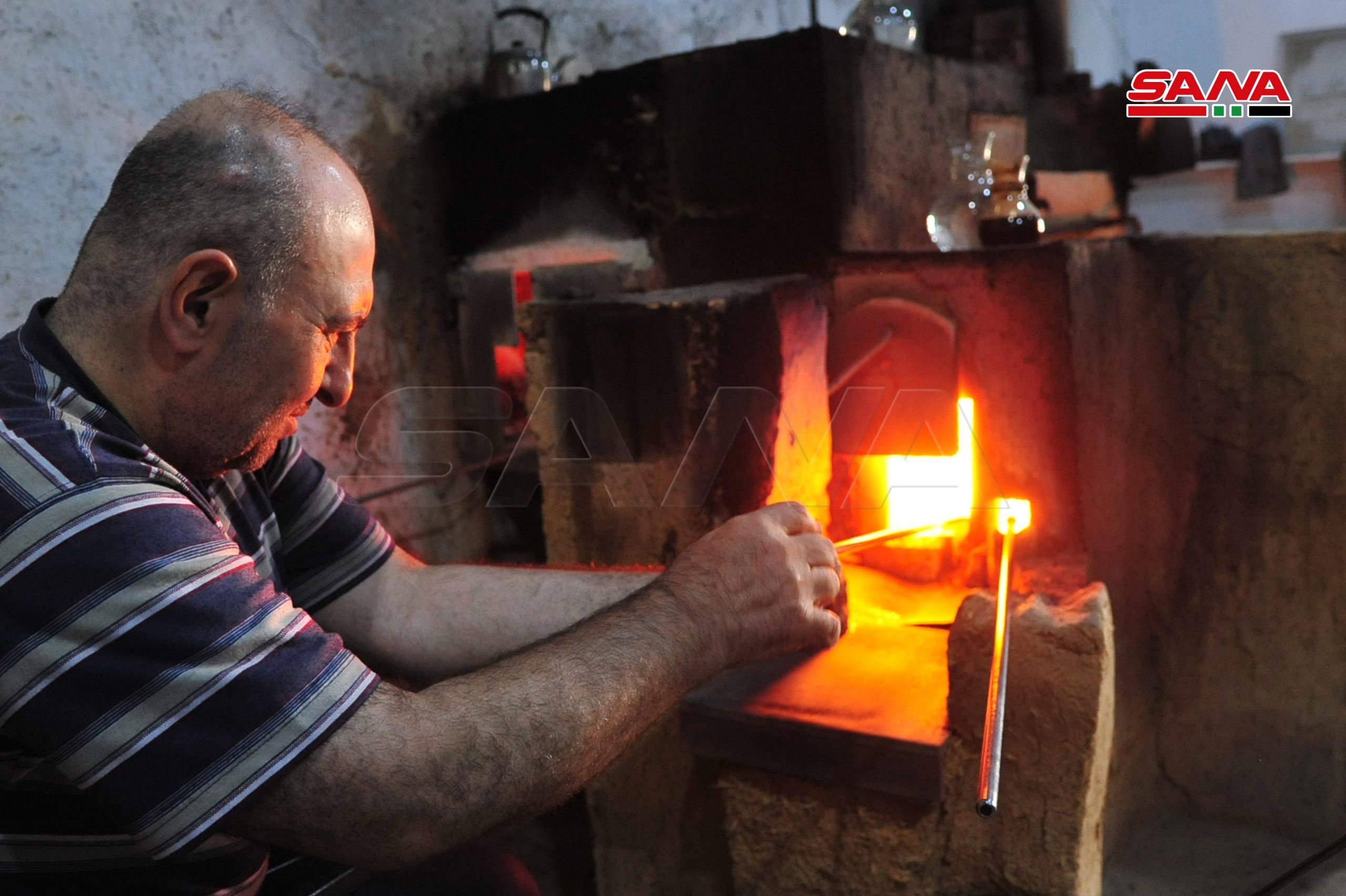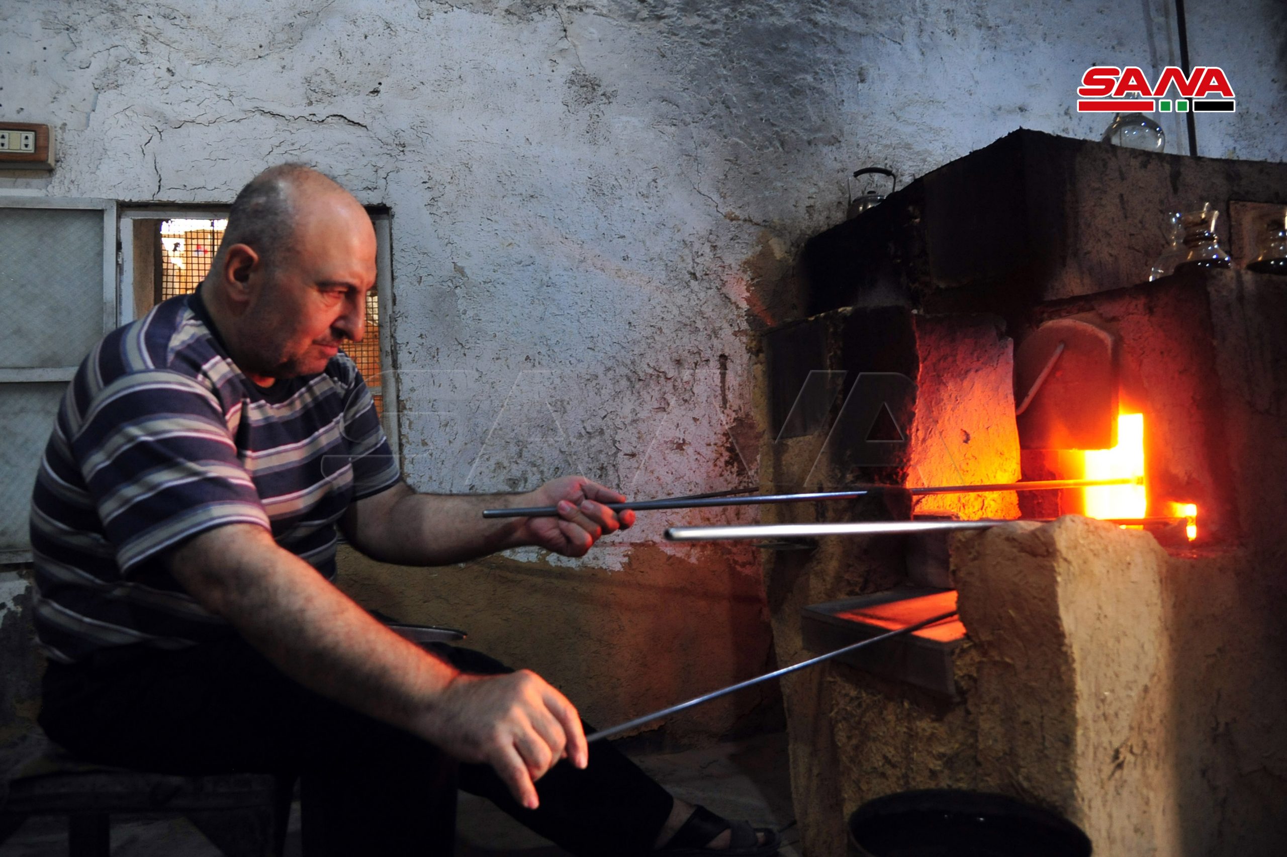 El artesano, Ahmed al-Hallaq, de 65 años de edad, cuenta a SANA su largo trayecto con la artesanía del vidrio soplado que junto a sus hermanos heredó de su padre y abuelo.